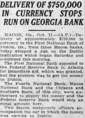 MACON, Ga., Oct. 12.-(P)-Delivery of approximately $800,000 in currency to the First National Bank of Dublin, Ga., from three Macon banks, stopped run the Dublin institution which began Saturday and continued Monday morning. The First National bank appealed to the federal reserve bank in Atlanta for immediate aid, which pas granted, but the problem was to get the money to Dublin. The Fourth National bank, Macon National bank and The Citizens and Southern bank, of this city, were authorized to supply the money the federal reserve bank to ship an equal amount here to replace it.
