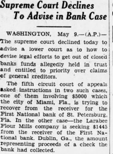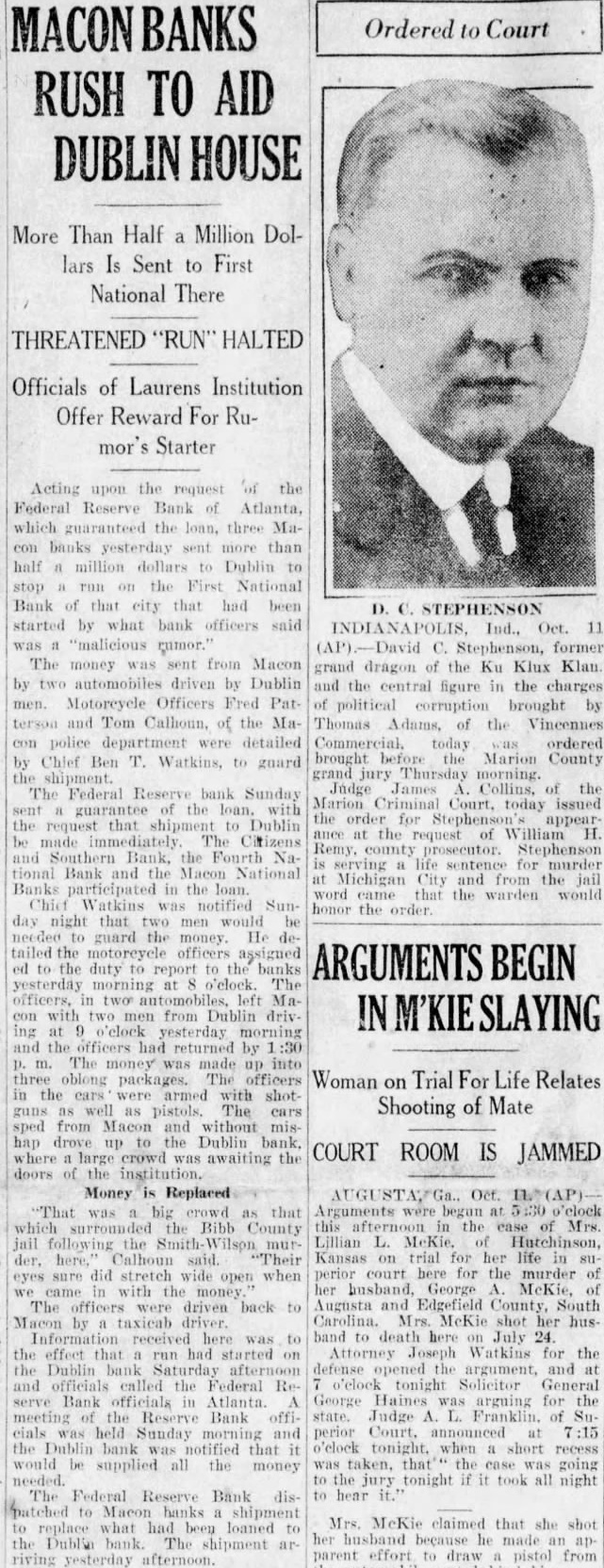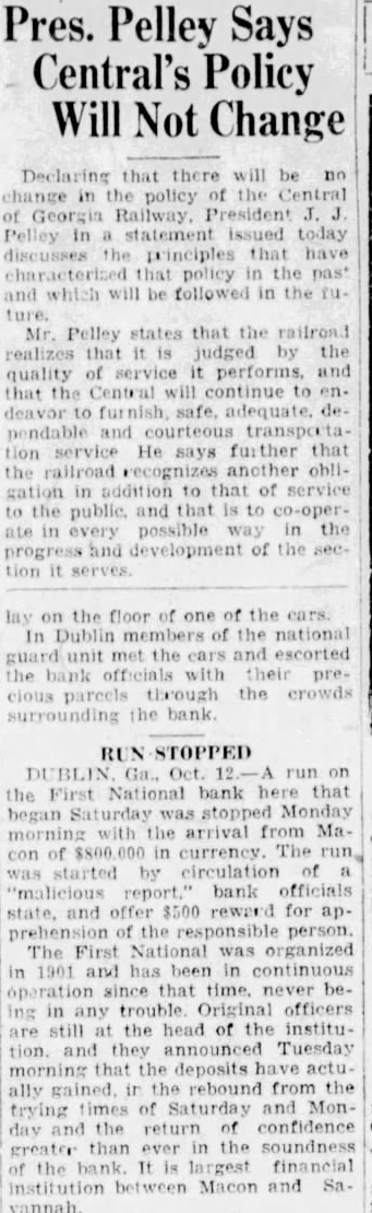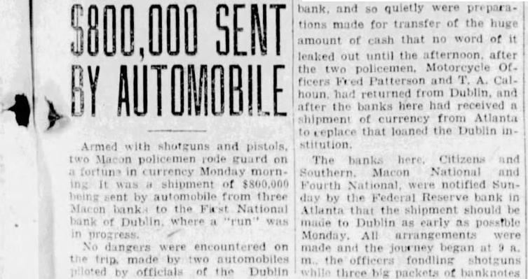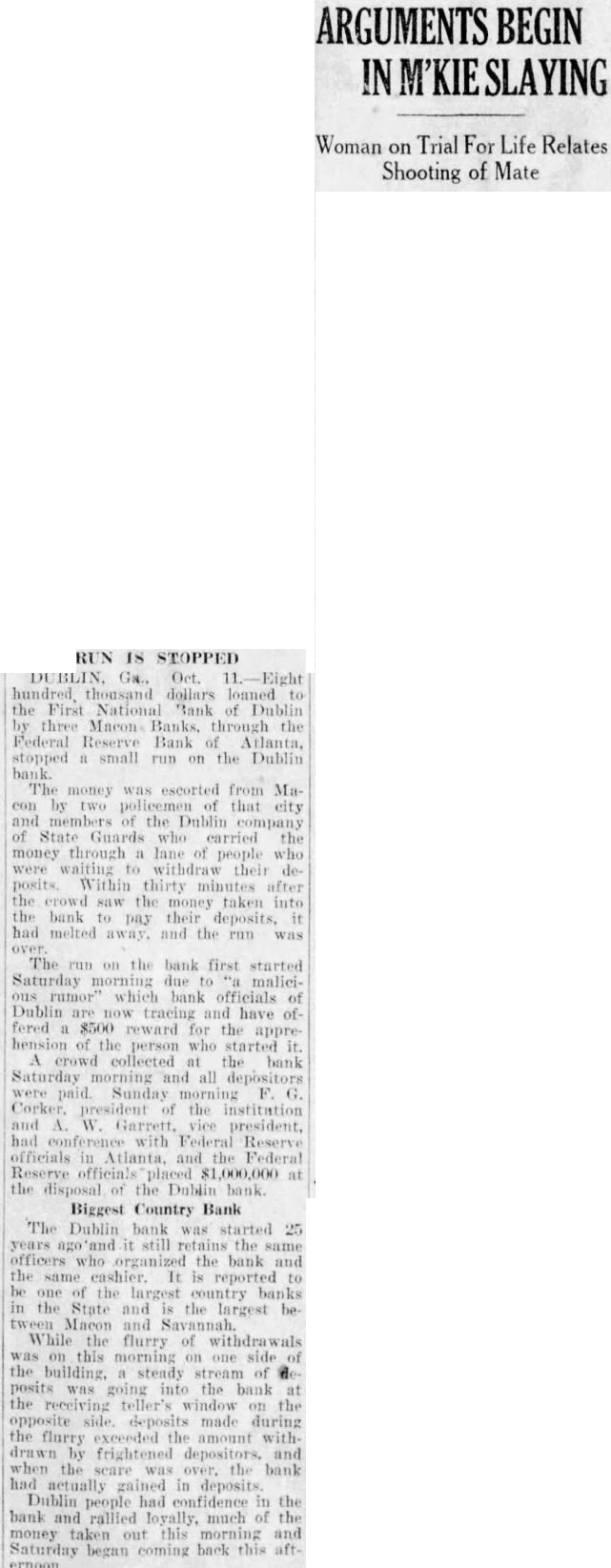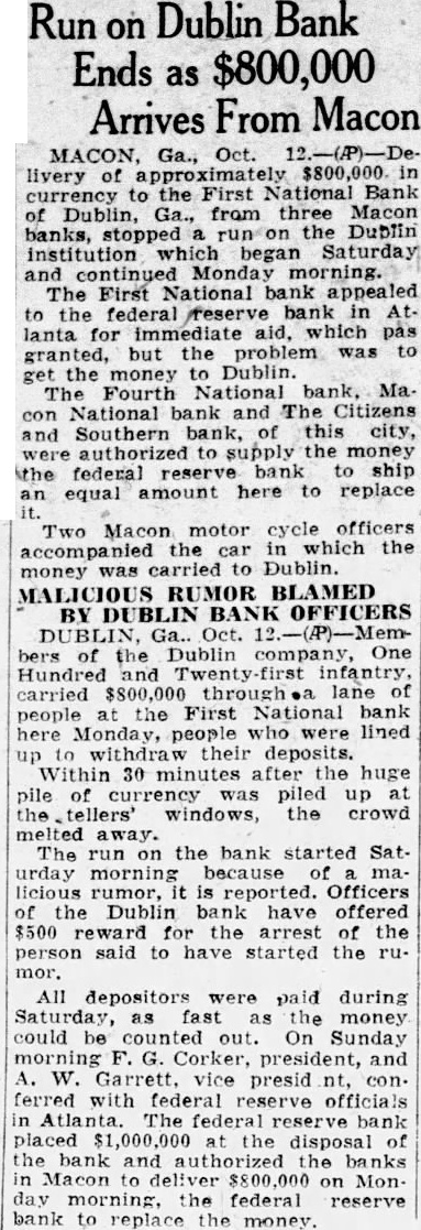 Two Macon motor cycle officers the in which the accompanied car money was carried to Dublin. MALICIOUS RUMOR BLAMED BY DUBLIN BANK OFFICERS DUBLIN, Ga.. Oct. 2.-(P)-Members of the Dublin company, One Hundred and Twenty infantry, carried $800,000 through lane of people at the First National bank here Monday, people who were lined up to withdraw their deposits. Within 30 minutes after the huge pile of currency was piled up at the tellers' windows, the crowd melted away. The run on the bank started Sat. urday morning because malicious rumor, it is reported. Officers of the Dublin bank have offered $500 reward for the arrest of the person said to have started the rumor. All depositors were paid during Saturday, as fast as the money could be counted out. On Sunday morning F. G. Corker, president, and A. W. Garrett. vice presid nt, con. ferred with federal reserve officials in The reserve bank placed $1,000,000 the disposal of the bank and authorized the banks in Macon to deliver $800.000 on Monday morning, the federal reserve bank to replace the money.