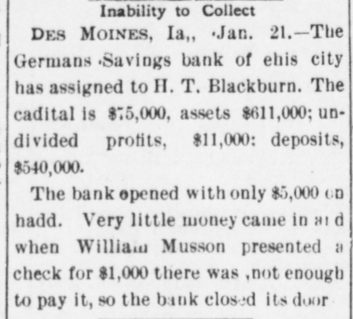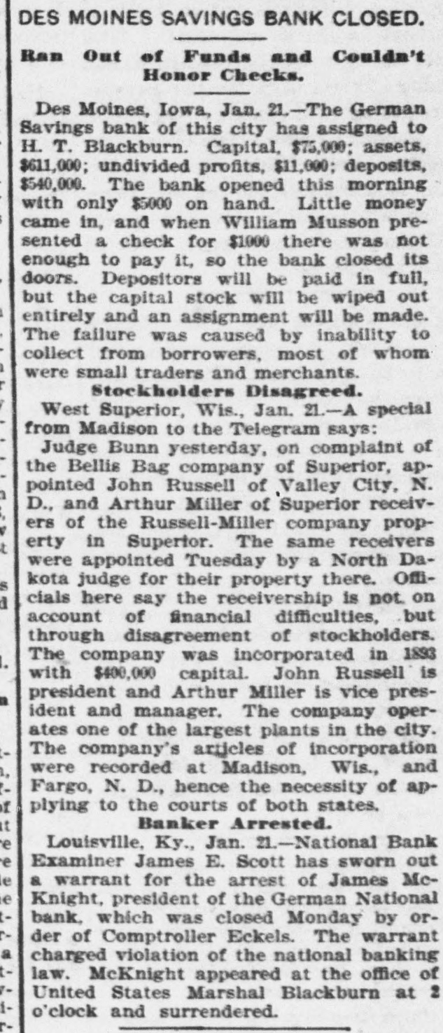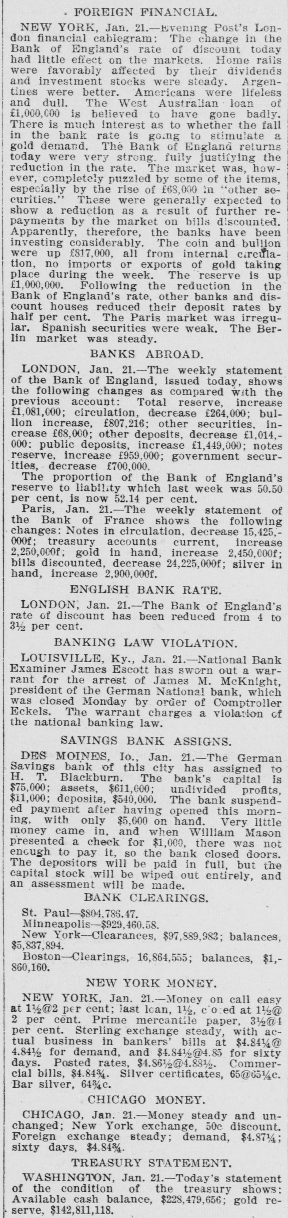 FOREIGN FINANCIAL. NEW YORK, Jan. 21.-Evening Post's London financial cablegram: The change in the Bank of England's rate of discount today had little effect on the markets. Home rails were favorably affected by their dividends and investment stocks were steady. Argentines were better. Americans were lifeless and dull. The West Australian loan of £1,000,000 is believed to have gone badly. There is much interest as to whether the fall in the bank rate is going to stimulate a gold demand. The Bank of England returns today were very strong. fully justifying the reduction in the rate. The market was, however, completely puzzled by some of the items, especially by the rise of £68,000 in "other securities.' These were generally expected to show a reduction as a result of further repayments by the market on bills discounted. Apparently, therefore, the banks have been investing considerably. The coin and bullion were up £817,000, all from internal eπrculation, no imports or exports of gold taking place during the week. The reserve is up £1,000,000. Following the reduction in the Bank of England's rate, other banks and discount houses reduced their deposit rates by half per cent. The Paris market was irregular. Spanish securities were weak. The Berlin market was steady. BANKS ABROAD. LONDON, Jan. 21.-The weekly statement of the Bank of England, issued today, shows the following changes as compared with the previous account: Total reserve, increase £1,081,000; circulation, decrease £264,000; bullion increase, £807,216; other securities, increase £68,000; other deposits, decrease £1,014,000: public deposits, increase £1,449,000; notes reserve, increase £959,000; government securities, decrease £700,000. The proportion of the Bank of England's reserve to liability which last week was 50.50 per cent, is now 52.14 per cent. Paris, Jan. 21.-The weekly statement of the Bank of France shows the following changes: Notes in circulation, decrease 15,425,000f; treasury accounts current, increase 2,250,000f; gold in hand, increase 2,450,000f; bills discounted, decrease 24,225,000f; silver in hand, increase 2,900,000f. ENGLISH BANK RATE. LONDON, Jan. 21.-The Bank of England's rate of discount has been reduced from 4 to 3½ per cent. BANKING LAW VIOLATION. LOUISVILLE, Ky., Jan. 21.-National Bank Examiner James Escott has sworn out a warrant for the arrest of James M. McKnight, president of the German National bank, which was closed Monday by order of Comptroller Eckels. The warrant charges a violation of the national banking law. SAVINGS BANK ASSIGNS. DES MOINES, Io., Jan. 21.-The German Savings bank of this city has assigned to H. T. Blackburn. The bank's capital is $75,000; assets, $611,000; undivided profits, $11,000; deposits, $540,000. The bank suspended payment after having opened this morning, with only $5,000 on hand. Very little money came in, and when William Mason presented a check for $1,000, there was not enough to pay it, SO the bank closed doors. The depositors will be paid in full, but the capital stock will be wiped out entirely, and an assessment will be made. BANK CLEARINGS. St. Paul-$804,786.47. Minneapolis-$929,460.58. New York-Clearances, $97,889,983; balances, $5,837,894. Boston-Clearings, 16,864,555; balances, $1,860,160. NEW YORK MONEY. NEW YORK, Jan. 21.-Money on call easy at 1½2 per cent; last loan, 1½, closed at 1½ 2 per cent. Prime mercantile paper, 3½1/2 per cent. Sterling exchange steady, with actual business in bankers' bills at $4.841/4@ 4.841/2 for demand, and $4.841/2@4.85 for sixty days. Posted rates, $4.861/2@4.83/2. Commercial bills, $4.843/4. Silver certificates, 65@651/4c. Bar silver, 643/4c. CHICAGO MONEY. CHICAGO, Jan. 21.-Money steady and unchanged; New York exchange, 50c discount. Foreign exchange steady; demand, $4.871/4; sixty days, $4.843/4. TREASURY STATEMENT. WASHINGTON, Jan. 21.-Today's statement of the condition of the treasury shows: Available cash balance, $228,479,656; gold reserve, $142,811,118.