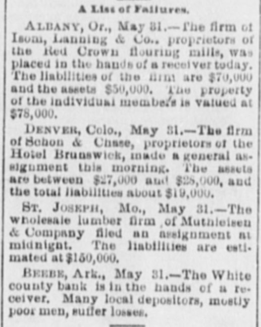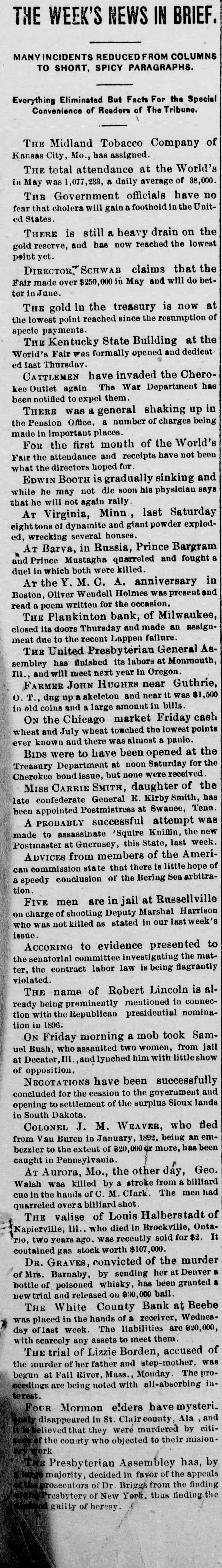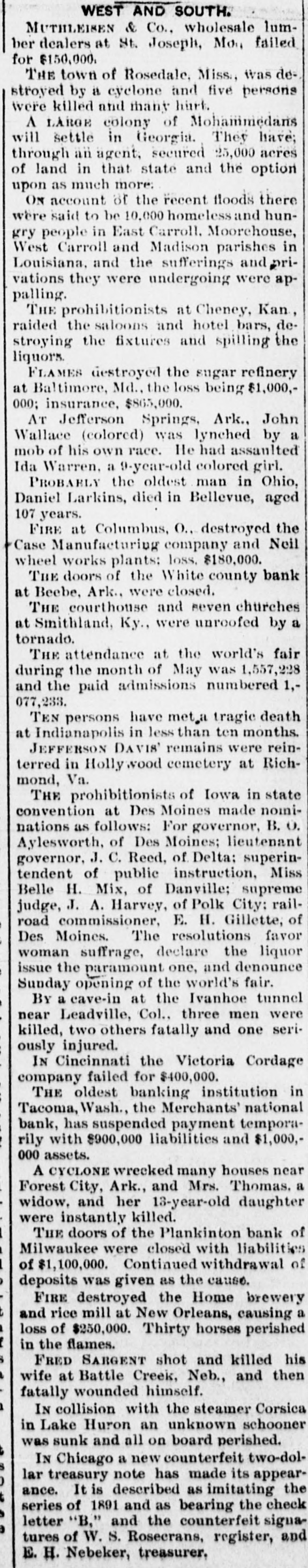 WEST AND SOUTH. MUTHLEISEN & Co., wholesale lumber dealers at St. Joseph, Mon failed for $150,000. THE town of Rosedale, Miss., was destroyed by a cyclone and five persons were killed and many hurt. A LARGE colony of Mohammedans will settle in Georgia. They have; through an agent, secured 25,000 acres of land in that state and the option upon as much more. ON account of the recent floods there were said to be 10,000 homeless and hunpeople in East Carroll. Moorehouse, gry West Carroll and Madison parishes in Louisiana, and the sufferings and privations they were undergoing were appalling. THE prohibitionists at Cheney, Kan, raided the saloons and hotel bars, destroying the fixtures and spilling the liquors. FLAMES destroyed the sugar refinery at Baltimore, Md., the loss being $1,000,000; insurance, $865,000. AT Jefferson Springs, Ark., John Wallace (colored) was lynched by a mob of his own race. He had assaulted Ida Warren, a 9-year-old colored girl. PROBABLY the oldest man in Ohio, Daniel Larkins, died in Bellevue, aged 107 years. FIRE at Columbus, O., destroyed the Case Manufacturing company and Neil wheel works plants: loss, $180,000. THE doors of the White county bank at Beebe, Ark., were closed. THE courthouse and seven churches at Smithland, Ky., were unroofed by a tornado. THE attendance at the world's fair during the month of May was 1,557,228 and the paid admissions numbered 1,077,233. TEN persons have meta tragic death at Indianapolis in less than ten months. JEFFERSON DAVIS' remains were reinterred in Holly wood cemetery at Richmond, Va. THE prohibitionists of Iowa in state convention at Des Moines made nominations as follows: For governor, B. O. Aylesworth, of Des Moines; lieutenant governor, J. C. Reed, of Delta: superintendent of public instruction, Miss Belle H. Mix, of Danville; supreme judge, J. A. Harvey, of Polk City: railroad commissioner, E. H. Gillette, of Des Moines. The resolutions favor woman suffrage, declare the liquor issue the paramount one, and denounce Sunday opening of the world's fair. BY a cave-in at the Ivanhoe tunnel Leadville, Col., three men were near killed, two others fatally and one seriously injured. IN Cincinnati the Victoria Cordage company failed for $400,000. THE oldest banking institution in Tacoma, Wash., the Merchants' national bank, has suspended payment temporarily with $900,000 liabilities and $1,000,000 assets. A CYCLONE wrecked many houses near Forest City, Ark., and Mrs. Thomas. a widow, and her 13-year-old daughter were instantly killed. THE doors of the Plankinton bank of Milwaukee were closed with liabilities of of $1,100,000. Continued withdrawal deposits was given as the cause. FIRE destroyed the Home brewery t and rice mill at New Orleans, causing a loss of $250,000. Thirty horses perished in the flames. FRED SARGENT shot and killed his wife at Battle Creek, Neb., and then fatally wounded himself. 1 IN collision with the steamer Corsica in Lake Huron an unknown schooner t was and all on board perished. a new S IN sunk Chicago counterfeit its two-dol0 lar treasury note has made appear- the t It is described as imitating b series ance. of 1891 and as bearing the check a letter "B," and the counterfeit siguatures of W. S. Rosecrans, register, and E. H. Nebeker, treasurer,