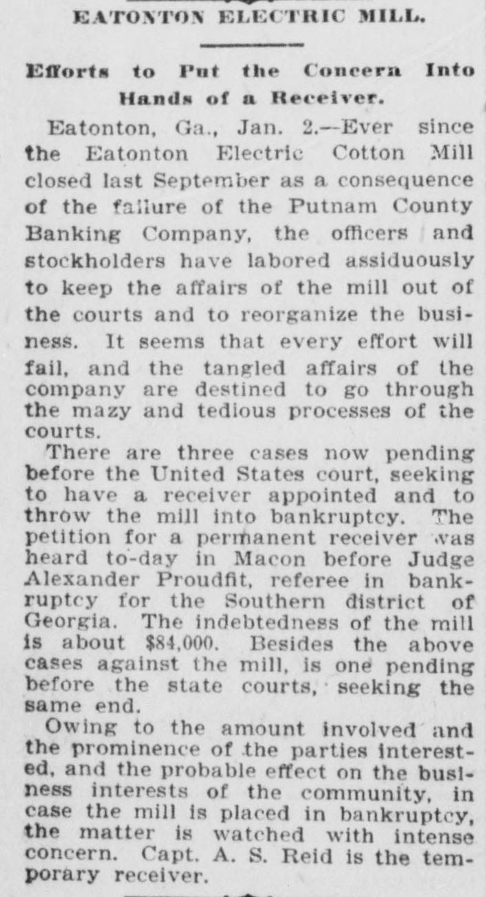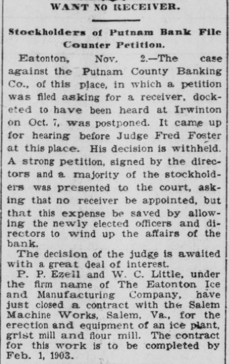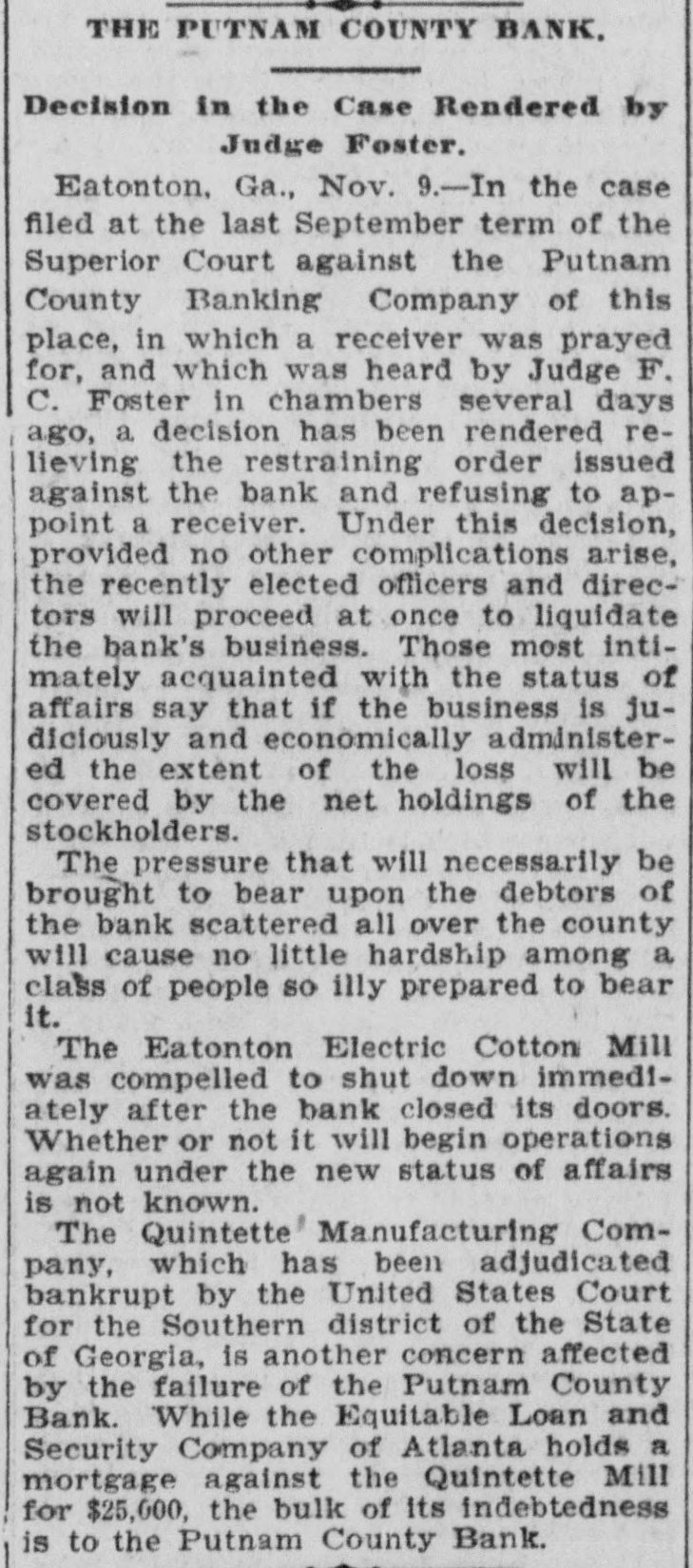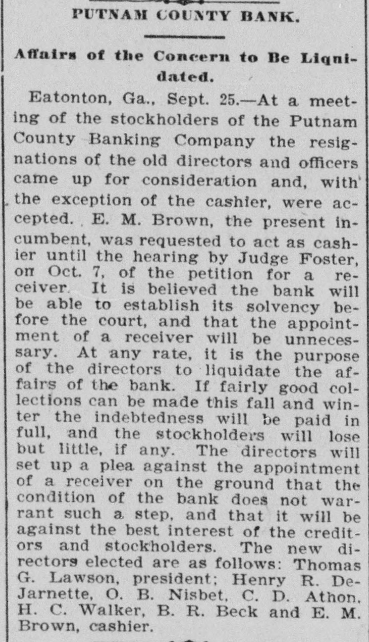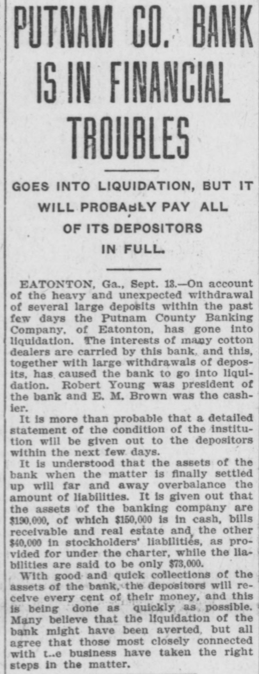 PUTNAM CO. BANK IS IN FINANCIAL TROUBLES GOES INTO LIQUIDATION, BUT IT WILL PROBABLY PAY ALL OF ITS DEPOSITORS IN FULL. EATONTON, Ga., Sept. 13.-On account of the heavy and unexpected withdrawal of several large deposits within the past few days the Putnam County Banking Company, of Eatonton, has gone into liquidation. The interests of many cotton dealers are carried by this bank, and this, together with large withdrawals of deposits, has caused the bank to go into liquidation. Robert Young was president of the bank and E. M. Brown was the cashier. It is more than probable that a detailed statement of the condition of the institution will be given out to the depositors within the next few days. It is understood that the assets of the bank when the matter is finally settled up will far and away overbalance the amount of liabilities. It is given out that the assets of the banking company are $190,000, of which $150,000 is in cash, bills receivable and real estate and the other $40,000 in stockholders' liabilities, as provided for under the charter, while the liabilities are said to be only $73,000. With good and quick collections of the assets of the bank, the depositors will recelve every cent of their money, and this is being done as quickly as possible. Many believe that the liquidation of the bank might have been averted, but all agree that those most closely connected with t..e business have taken the right steps in the matter.