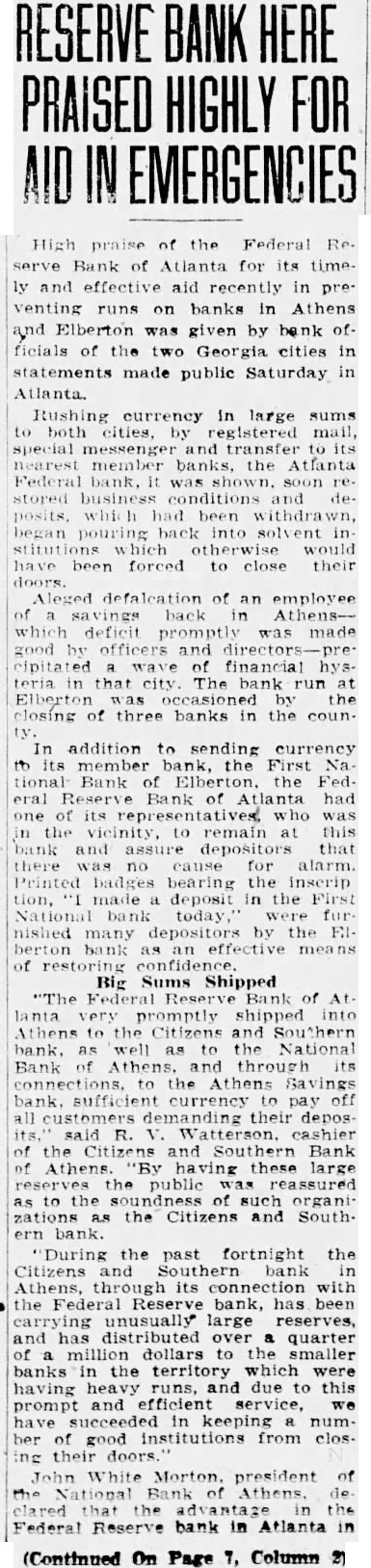 HIGH PRAISE ACCORDED FEDERAL RESERVE BANK SAVED MANY INSTITUTIONS IN DISTRESS DURING YEARPREVENTED RUNS Atlanta, Ga.-High praise for the Federal Reserve Bank, of Atlanta, for its timely and effective aid recently in preventing runs on banks in Athens and Elberton was given by bank officials of the two Georgia cities in statements made public. Rushing currency in large sums to both cities, by registered mail, special messenger and transfer to its nearest member banks, the Atlanta Federal Bank, it was shown, soon restored business conditions and deposits, which had been withdrawn, began pouring back into solvent institutions which otherwise would have been forced to close their doors. Alleged defalcation of an employe of a bank in Athens-which officers deficit a a wave of financial hysteria in that city. The bank run at Elberton was occasioned by the closing of three banks in the county. In addition to sending currency to its member bank, the First National Bank of Elberton, the Federal Reserve Bank of Atlanta had one of its representatives, who was in the vicinity, to remain at this bank and assure depositors that there was no cause for alarm. Printed badges bearing the inscription, "I made a Deposit in the First National Bank today," were furnished many depositors by the Elberton Bank as an effective means of restoring confidence. Big Sums Shipped "The Federal Reserve Bank of AtAthens to the Citizens and Southern lanta very promptly shipped into Bank, as well as to the National Bank of Athens, and through its connections, to the Athens Savings Bank, sufficient currency to pay off all customers demanding their deposits," said R. V. Watterson, cashier of the Citizens and Southern Bank of Athens. "By having these large reserves the public was reassured as to the soundness of such organizations as the Citzens and Southern Bank. "During the past fortnight the Citizens and Southern Bank in Athens, through its connections with the Federal Reserve Bank, has been carrying unusually large reserves, and has distributed over a quarter of a million dollars to the smaller banks in the territory which were having heavy runs, and due to this prompt and efficient service, we have succeeded in keeping a number of good institutions from closing their doors." Advantage of Accessibility John White Morton, president of the National Bank of Athens, declared that the advantage in the Federal Reserve Bank in Atlanta is a situation like that recently in Athens is its accessibility. "The banks in small communities do not like to carry actual cash beyond their usual needs and in Athens, to illustrate, all we had to do was to telephone the Federal Reserve Bank I in Atlanta what we wanted and it had funds in Athens on the first train. The Atlanta bank could have put money in Athens in three hours time by auto, if necessary, and offered to do SO. "Besides this the Federal Reserve Bank of Atlanta as a government agency is able to handle situations of this kind at once for its member banks while, on the other hand, considerable red tape and time would be consumed in dealing direct with Washington, if it could be done at all, and non-member banks where they no doubt could arrange with their correspondents to care for such an emergency, of necessity could not handle it so expeditiously as a member bank with the Federal Reserve Bank of Atlanta." Major H. P. Hunter, cashier of the First National Bank of Elberton, said that the prompt and thorough action of the Federal Reserve Bank of Atlanta, in supplying funds and stationing one of its representatives in his bank, entirely restored confidence. "We were inconstant touch by telephone and telegraph with the Federal bank in Atlanta, with its unlimited funds and great reservoir of credit," said Major Hunter. "This taken with the strength and solidarity of our bank brought order out of seeming chaos in a remarkably short time; in fact, deposits which had previously been withdrawn, poured back to such an extent that for the time being it became necessary to increase our clerical force." Billions Handled by System The Federal Reserve Bank, of Atlants of which M. B. Wellborn is gov-