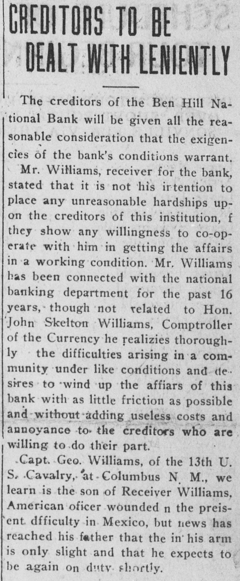 Mr. Williams, receiver for the bank, stated that it is not his intention to place any unreasonable hardships upon the creditors of this institution, if they show any willingness to co-operate with him in getting the affairs in a working condition. Mr. Williams has been connected with the national banking department for the past 16 years, though not related to Hon. John Skelton Williams, Comptroller of the Currency he realizies thoroughly the difficulties arising in a community under like conditions and desires to wind up the affiars of this bank with as little friction as possible and without adding useless costs and annoyance to the creditors who are willing to do their part.