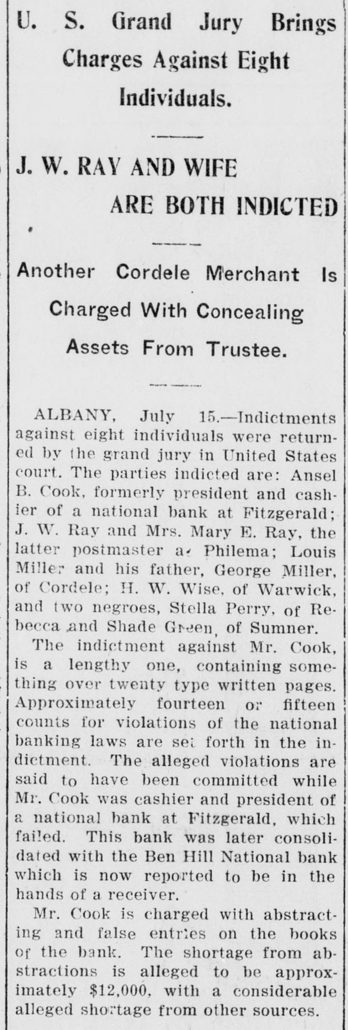 U. S. Grand Jury Brings Charges Against Eight Individuals. J. W. RAY AND WIFE ARE BOTH INDICTED Another Cordele Merchant Is Charged With Concealing Assets From Trustee. ALBANY, July 15.-Indictments against eight individuals were returned by the grand jury in United States court. The parties indicted are: Ansel B. Cook, formerly president and cashier of a national bank at Fitzgerald; J. W. Ray and Mrs. Mary E. Ray, the latter postmaster a: Philema; Louis Miller and his father, George Miller, of Cordele; H. W. Wise, of Warwick, and two negroes, Stella Perry, of Rebecca and Shade Green, of Sumner. The indictment against Mr. Cook, is a lengthy one, containing something over twenty type written pages. Approximately fourteen or fifteen counts for violations of the national banking laws are set forth in the indictment. The alleged violations are said to have been committed while Mr. Cook was cashier and president of a national bank at Fitzgerald, which failed. This bank was later consolidated with the Ben Hill National bank which is now reported to be in the hands of a receiver. Mr. Cook is charged with abstracting and false entries on the books of the bank. The shortage from abstractions is alleged to be approximately $12,000, with a considerable alleged shortage from other sources.