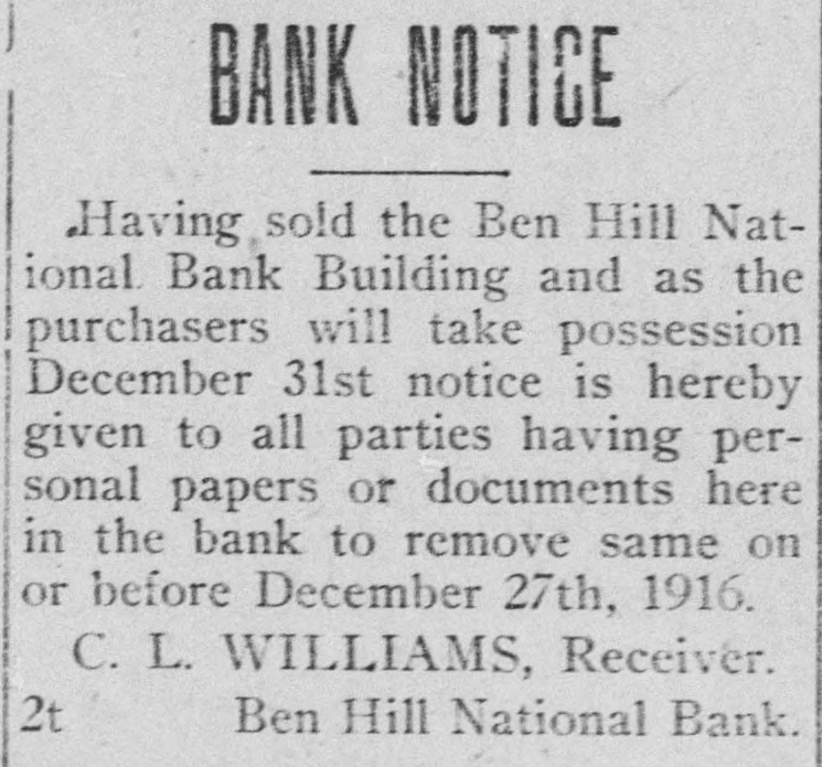 BANK NOTICE Having sold the Ben Hill National Bank Building and as the purchasers will take possession December 31st notice is hereby given to all parties having personal papers or documents here in the bank to remove same on or before December 27th, 1916. C. L. WILLIAMS, Receiver. 2t Ben Hill National Bank.