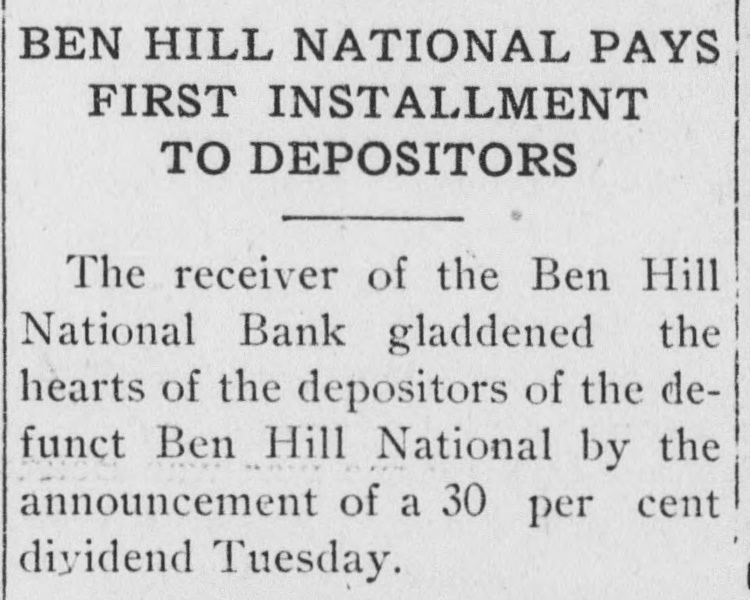 BEN HILL NATIONAL PAYS FIRST INSTALLMENT TO DEPOSITORS The receiver of the Ben Hill National Bank gladdened the hearts of the depositors of the defunct Ben Hill National by the announcement of a 30 per cent dividend Tuesday.