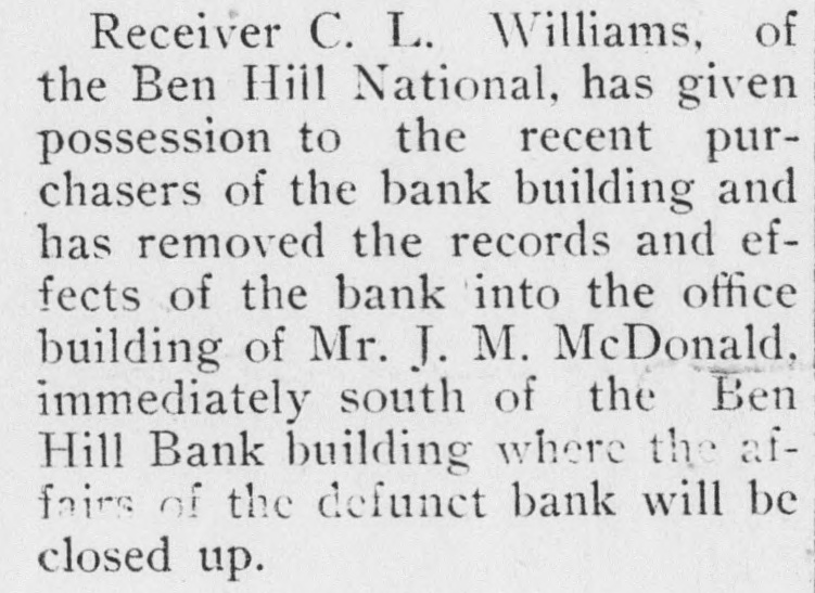 Receiver C.L. Williams, of the Ben Hill National, has given possession to the recent purchasers of the bank building and has removed the records and effects of the bank into the office building of Mr. J. M. McDonald. immediately south of the Ben Hill Bank building where the affairs of the defunct bank will be closed up.