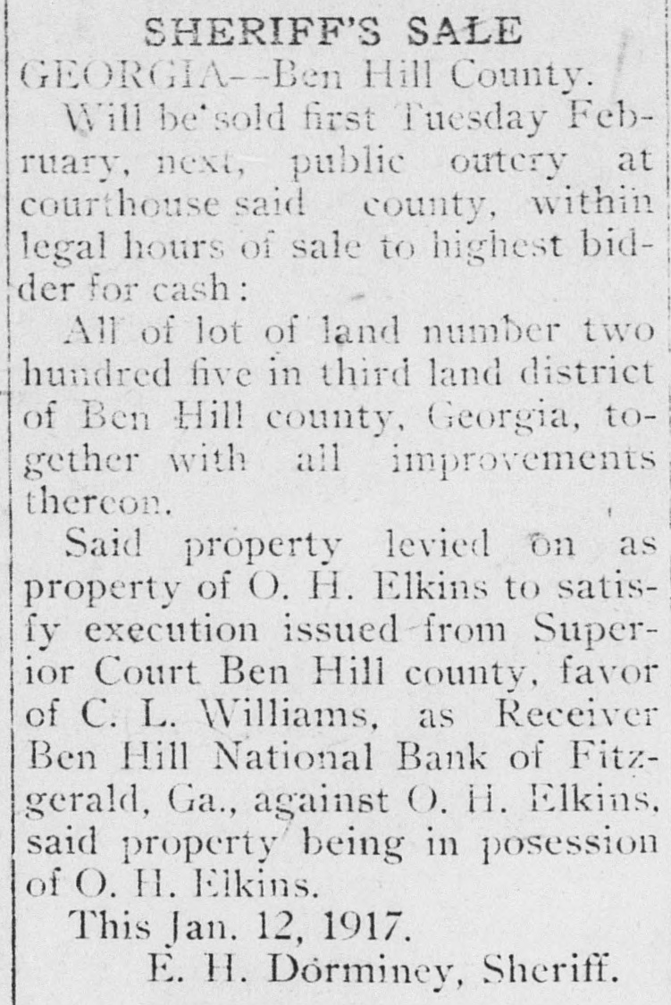SHERIFF'S SALE GEORGIA--Ben Hill County. Will be'sold first Tuesday February, next, public outery at courthouse said county, within legal hours of sale to highest bidder for cash: All of lot of land number two hundred five in third land district of Ben Hill county, Georgia, together with all improvements thereon. Said property levied on as property of O. H. Elkins to satisfy execution issued from Superior Court Ben Hill county, favor of C.L. Williams, as Receiver Ben Hill National Bank of Fitzgerald, Ga., against O. H. Elkins. said property being in posession of O. H. Elkins. This Jan. 12, 1917. E. H. Dorminey, Sheriff.
