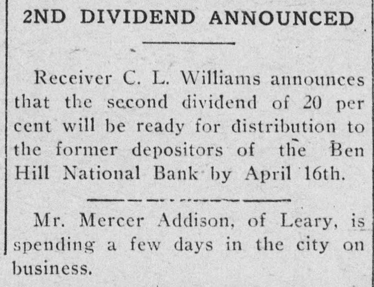 Receiver C. L. Williams announces that the second dividend of 20 per cent will be ready for distribution to the former depositors of the Ben Hill National Bank by April 16th.