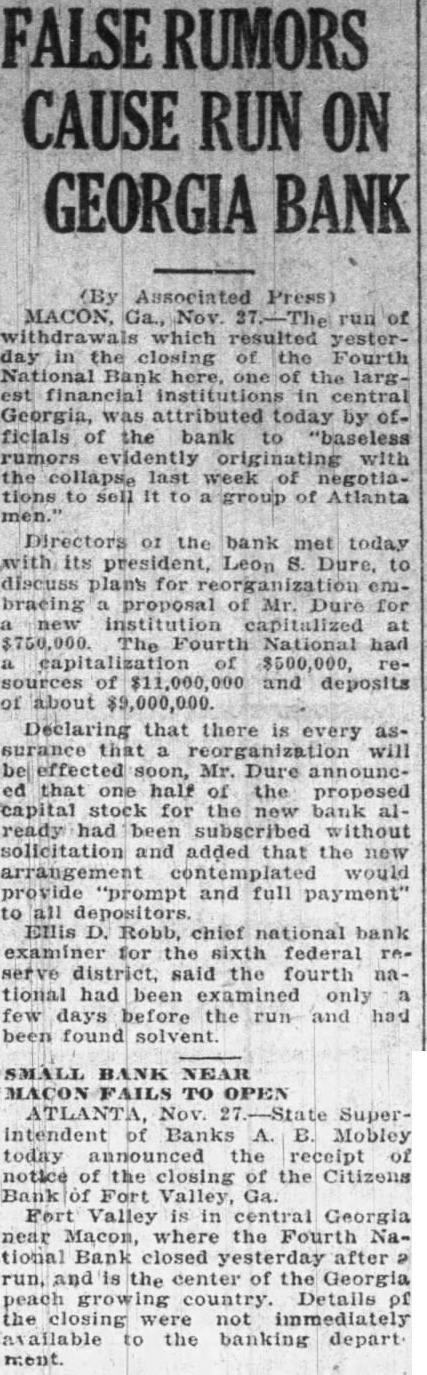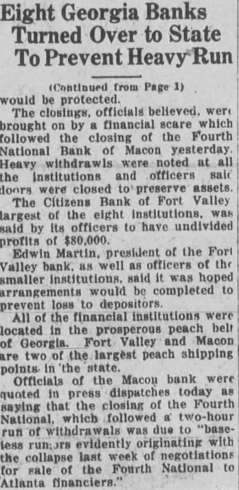 (By The Associated Press) heavy run which followed the closing of the Fourth National Bank of Macon yesterday was said responsible today for the suspension of business by the Citizens Bank of Fort Valley, an institution with of $330,000. In referring to the bank's failure to open for business this morning, President Martin at conferences between the directors last night and today, the condition brought about by the closing of the Fourth National Bank in Macon were, considered and it was decided that in order to conserve the assets of the Citizens Bank it was decided to turn the bank over to the State Banking Department. The president said the bank was solvent and he hoped some arrangement could be worked with depositors to prevent any losses.