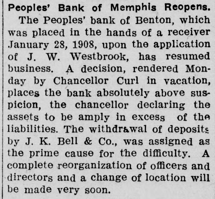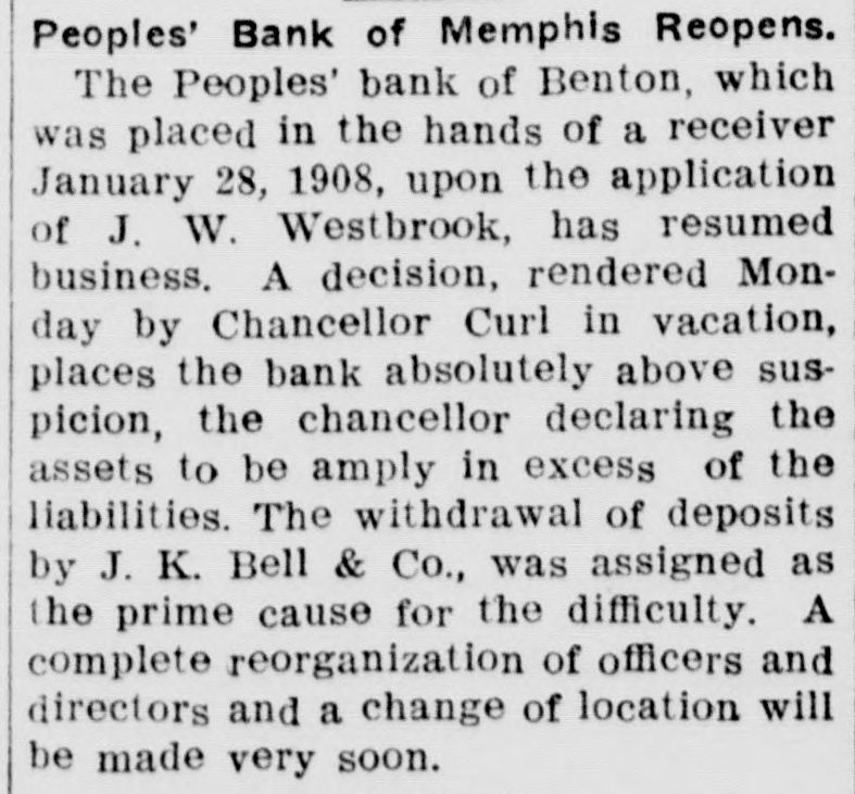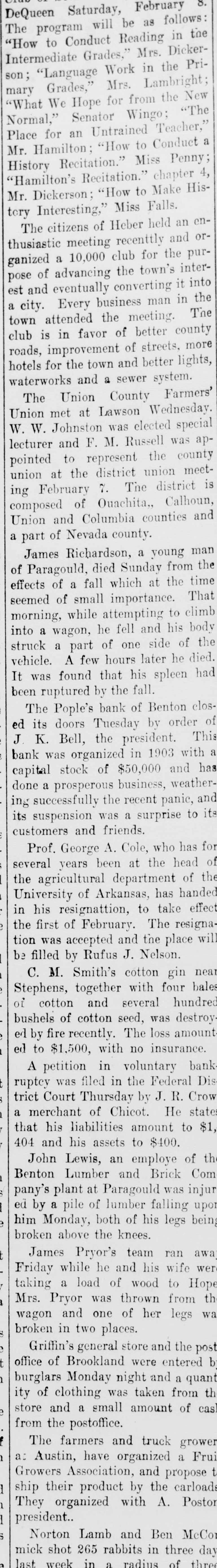 DeQueen will be as in the The program to Conduct Reading Mrs. Dickerin the Prison; "Language Mrs. Intermediate "How Grades," Work Lambright; mary Hope for from the an a Place for to Mr. Recitation." Miss "How History Recitation." to Make "What Normal," Dickerson; Hamilton; Grades," We Senator Untrained "How Wingo; Falls. Conduct chapter Teacher," Penny; "The New His- en- 4, Mr. tory Interesting," of Heber Miss held an "Hamilton's The citizens recenttly and orthusiastic club for a the town's it of eventually converting man in Every ganized pose est and advancing meeting 10,000 business the inter- pur- into the a attended the in favor of better for the town club roads, town city. is improvement and of meeting. better streets, county lights, more The hotels and a sewer Lawson waterworks The Union County Wednesday. system. Farmers' Union met at was elected special W. and F. M. Russell was lecturer to represent the meetW. pointed Johnston union county apunion February at the district 7. The district is ing of Quachita,, composed and Columbia counties a of Nevada Union part county. young Calhoun, man and Richardson, a from of Paragould, a fall which at the That time of small to effects James of died importance. Sunday climb the while attempting he fell and his of into a wagon, of one side a A few hours later seemed morning, struck part he died. body had the vehicle. was found that his spleen been It ruptured by the fall. bank of Benton order clos- of The Pople's doors Tuesday by This ed its Bell, the president. with J. K. was organized in 1903 and has a bank stock of $50,000 weathercapital prosperous business, and done successfully a the recent panic, its ing its suspension was a surprise to customers and friends. Prof. George A. Cole, who head has for of years been at the of several agricultural department the of Arkansas, has take effect resignattion, to University his resigna- handed the in of February. The will the was accepted and the by Rufus J. be tion filled first cotton Nelson. place gin near Stephens, C. M. Smith's together several with four hundred bales of of cotton seed, was amount bushels cotton and destroy fire recently. The loss insurance. ed ed by to $1,500, with no bank petition in voluntary Federal Dis A was filed in the R. Crow ruptcy Court Thursday by J. He states trict merchant of Chicot. $1, a his liabilities amount to 404 that and his assets to $400. John Lewis, an employe of Com th Lumber and Brick Benton plant at Paragould was injur upon pany's pile of lumber falling being him ed by Monday, a both of his legs broken above the knees. James Pryor's team ran wife awa wer while he and his Hope Friday a load of wood to from th taking Pryor was thrown wa Mrs. wagon and one of her legs broken in two places. Griffin's general store and the post b of Brookland were entered office Monday night and from a quant th burglars of clothing was taken of cas ity store and a small amount from the postoffice. The farmers and truck grower Frui t Austin, have organized a a: Growers Association, and propose carloads their product by the Poston ship They organized with A. president.. Lamb and Ben McCor day last Norton 265 rabbits in three week mick shot in a radius of