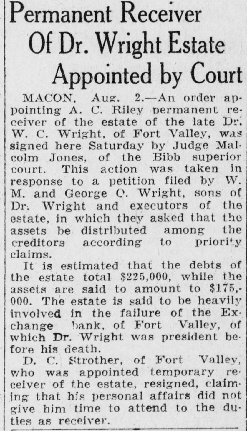 Permanent Receiver Of Dr. Wright Estate Appointed by Court MACON, Aug. 2.-An order appointing A. C. Riley permanent receiver of the estate of the late Dr. W. C. Wright, of Fort Valley, was signed here Saturday by Judge Malcolm Jones, of the Bibb superior court. This action was taken in response to a petition filed by W. M. and George C. Wright, sons of Dr. Wright and executors of the estate, in which they asked that the assets be distributed among the creditors according to priority claims. It is estimated that the debts of the estate total $225,000, while the assets are said to amount to $175,000. The estate is said to be heavily involved in the failure of the Exchange bank, of Fort Valley, of which Dr. Wright was president be. fore his death. D. C. Strother, of Fort Valley, who was appointed temporary re. ceiver of the estate, resigned, claim. ing that his personal affairs did not give him time to attend to the duties as receiver.