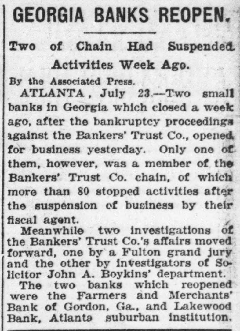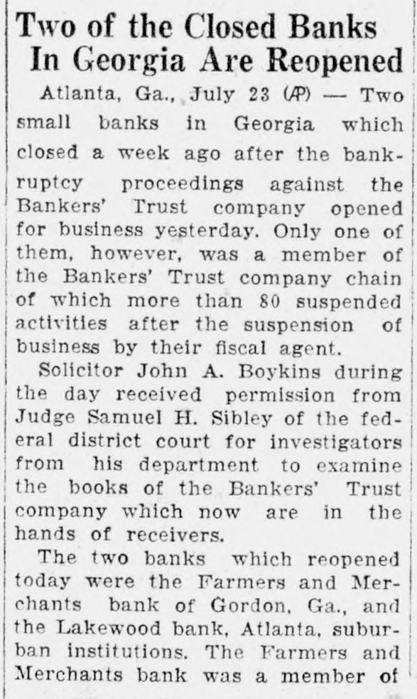 Two of the Closed Banks In Georgia Are Reopened Atlanta, Ga., July 23 (AP) - Two small banks in Georgia which closed a week ago after the bankruptcy proceedings against the Bankers' Trust company opened for business yesterday. Only one of them, however, was a member of the Bankers' Trust company chain of which more than 80 suspended activities after the suspension of business by their fiscal agent. Solicitor John A. Boykins during the day received permission from Judge Samuel H. Sibley of the federal district court for investigators from his department to examine the books of the Bankers' Trust company which now are in the hands of receivers. The two banks which reopened today were the Farmers and Merchants bank of Gordon, Ga., and the Lakewood bank, Atlanta, suburban institutions. The Farmers and Merchants bank was a member of