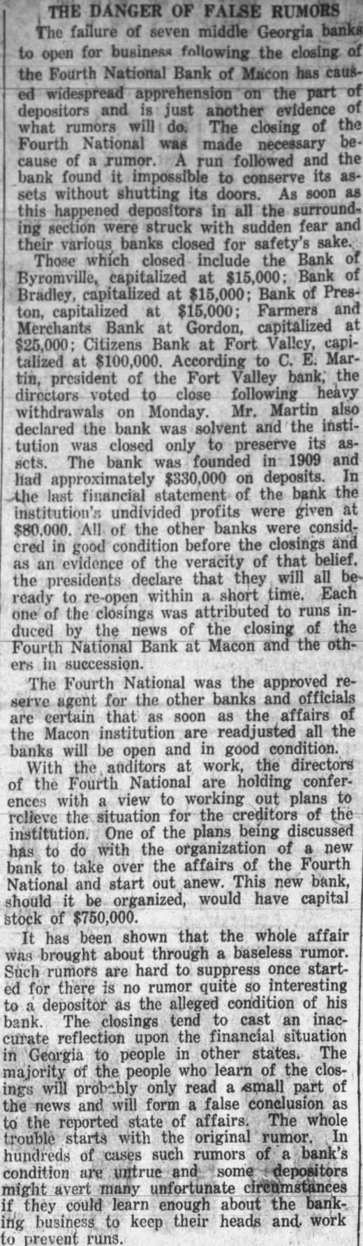 EIGHT GEORGIA BANKS CLOSED Institution Drags Small Ones Down United MACON, Nov. 28. Eight small Georgia banks were closed today result of failure bank, Macon, with listed reof more than With the exception the Citizens' bank, of Fort Valley, capitalized at other institutions, Bank of Byronville, Irwinton bank, Bank of Preston, Citizens' Bank company, of Culloden, Bank of Bradley, Farmers' Merchants' bank, of Gordon, Farmers' bank, of at from $15,000 to were closed aftheavy runs due to the scare that followed ing of the Macon bank. All the banks are located in the Georgia peach With Clyde J. Edwards in charge of an audit, and Claude Gilbert, named of the Fourth National plans under today to adjust affairs could be cared for. Exact cause of the run was concealed, altho circles said recent investments had turned out poorly.