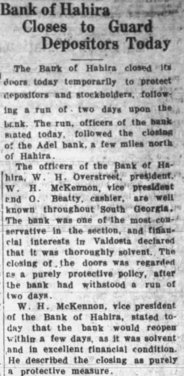 Bank of Hahira Closes to Guard Depositors Today The Bank of Habira closed doors today temporarily to protect depositors and stockholders, followof two days upon the ing run The officers of the bank followed the closing mated Adel few miles north of the of The officers of the Bank of W H. Overstreet, president. H. McKennon, vice president and 0. Beatty, cashier, are well known throughout South The bank was one servative in the section, and financlal interests in Valdosta declared that It was thoroughly solvent. The closing of the doors was regarded 08 purely protective policy, after the bank had withstood run of two days. W H McKennon, vice president of the Bank of Hahira, stated today that the bank would reopen within few days, as it was solvent and in excellent financial condition. He described the closing as purely protective measure.