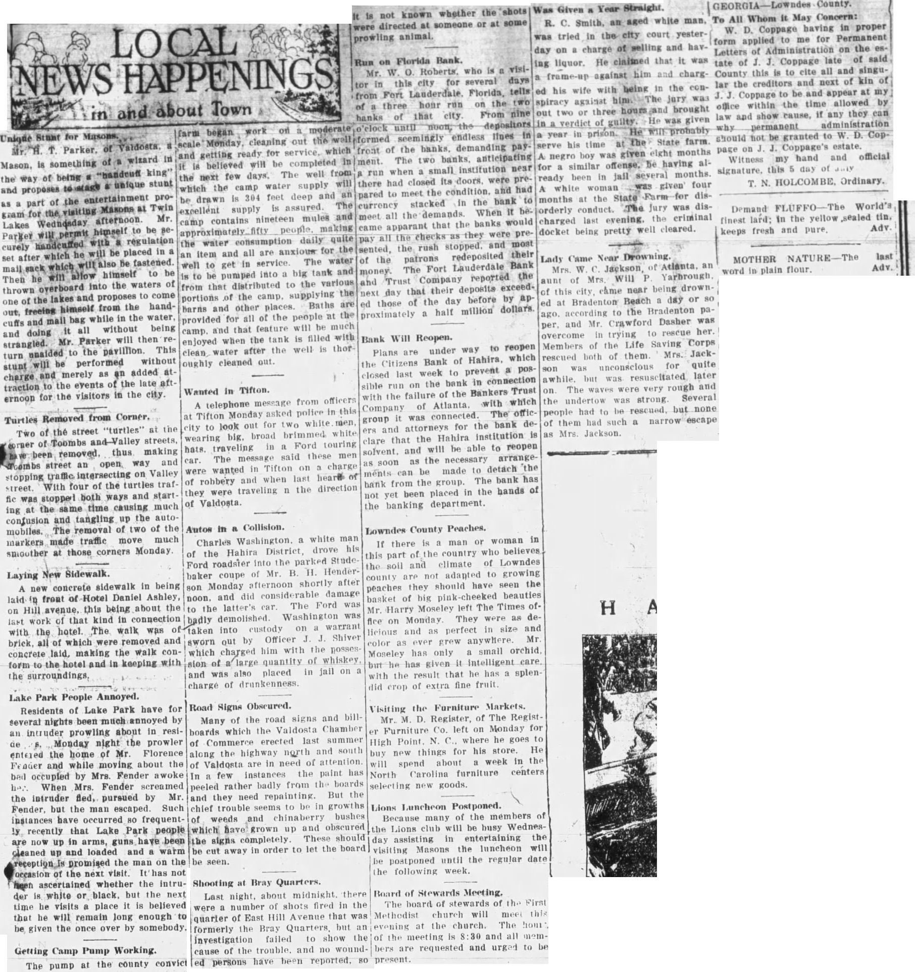 LOCAL NEWS HAPPENINGS about Town and Mason, is something of wizard in the way of being # "handruff king" and proposes to atage a unique stunt as a part of the entertainment program for the visiting Masons at Twin Mr. Lakes Wednesday afternoon. Parker will permit himself to be securely handcuned with a regulation a set after which he will be placed in mail sack which will be fastened. Then he will allow himself to be thrown overboard into the waters of one of the lakes and proposes to come out, freeing himself from the handcuffs and mail bag while in the water, and doing it all without being strangled. Mr. Parker will then return unaided to the pavillion. This stunt will be performed without charge and merely as an added attraction to the events of the late aft ernoon for the visitors in the city. Turtles Removed from Corner. Two of the street "turtles" at the corner of Toombs and-Valley streets, been removed, thus making Toombs street an open way and stopping traffic intersecting on Valley street. With four of the turtles traffic was stopped both ways and starting at the same time causing much confusion and tangling up the automobiles. The removal of two of the markers made traffic move much smoother at those corners Monday Laying New Sidewalk. A new concrete sidewalk in being laid in front of Hotel Daniel Ashley, on Hill avenue, this being about the last work of that kind in connection with the hotel. The walk was of brick, all of which were removed and concrete laid, making the walk conform to the hotel and in keeping with the surroundings. Lake Park People Annoyed. Residents of Lake Park have for several nights been much annoyed by an intruder prowling about in reside S. Monday night the prowler entered the home of Mr. Florence Fender and while moving about the bed occupied by Mrs. Fender awoke her. When Mrs. Fender screamed the intruder fled, pursued by Mr. Fender, but the man escaped. Such instances have occurred 80 frequently recently that Lake Park people are now up in arms, guns have been cleaned up and loaded and a warm reception Is promised the man on the occasion of the next visit. It has not been ascertained whether the intruder is white or black. but the next time he visits a place it is believed that he will remain long enough to be given the once over by somebody. Getting Camp Pump Working. The pump at the county convict on and getting ready for service, which it is believed will be completed in the next few days. The well from which the camp water supply will be drawn is 304 feet deep and an excellent supply is assured. The camp contains nineteen mules and fifty people making the water consumption daily quite an item and all are anxious for the well to get in service The water is to be pumped into a big tank and from that distributed to the various portions of the camp. supplying the barns and other places. Baths are provided for all of the people at the camp. and that feature will be much enjoyed when the tank is filled with clean, water after the well is thor oughly cleaned out. Wanted in Tifton. A telephone message from officers at Tifton Monday asked police in this city to look out for two white men, wearing big. broad brimmed white hats. traveling in a Ford touring car. The message said these men were wanted in Tifton on charge of robbery and when last heard of they were traveling n the direction of Valdosta. Autos in a Collision. Charles Washington a white man of the Hahira District, drove his Ford roadster into the parked Studebaker coupe of Mr. B. H. Henderson Monday afternoon shortly after noon. and did considerable damage to the latter's car. The Ford was badly demolished. Washington was taken into eustody on a warrant sworn out by Officer J. J. Shiver which charged him with the possession of large quantity of whiskey and was also placed in jail on a charge of drunkenness. Road Signs Obseured. Many of the road signs and billboards which the Valdosta Chamber of Commerce erected last summer along the highway north and south of Valdosta are in need of attention. In a few instances the paint has peeled rather badly from the boards and they need repainting. But the chief trouble seems to be in growths of weeds and chinaberry bushes which have grown up and obscured the signs completely. These should be cut away in order to let the board be seen. Shooting at Bray Quarters. Last night, about midnight. there were a number of shots fired in the quarter of East Hill Avenue that was formerly the Bray Quarters, but an investigation failed to show the cause of the trouble. and no wounded persons have been reported. 80 present. It is not known whether the shots were directed at someone or at some prowling animal. Run on Florida Bank. Mr. W. O. Roberts. who is a visitor in this city for several days from Fort Lauderdale. Florida, tells of three hour run on the two hanks of that city From nine o'clock until noon, the depositors front of the banks, demanding pay ment. The two banks. anticipating a run when a small institution near there had closed its doors. were prepared to meet the condition. and had currency stacked in the bank to meet all the demands. When it became apparant that the banks would pay all the checks as they were presented, the rush stopped. and most of the patrons redeposited their money The Fort Lauderdale Bank and Trust Company reported the next day that their deposits exceeded those of the day before by approximately a half million dollars. Bank Will Reopen. Plans are under way to reopen the Citizens Bank of Hahira, which closed last week to prevent a possible run on the bank in connection with the failure of the Bankers Trust Company of Atlanta. with which group it was connected. The officers and attorneys for the bank declare that the Hahira institution is solvent. and will be able to reopen as soon as the necessary arrangements can be made to detach the bank from the group. The bank has not yet been placed in the hands of the banking department. Lowndes C