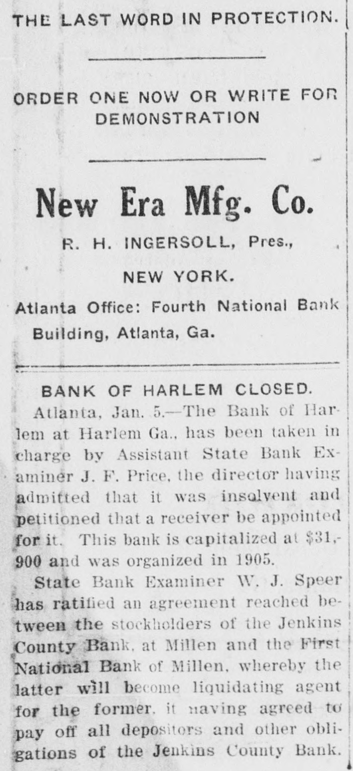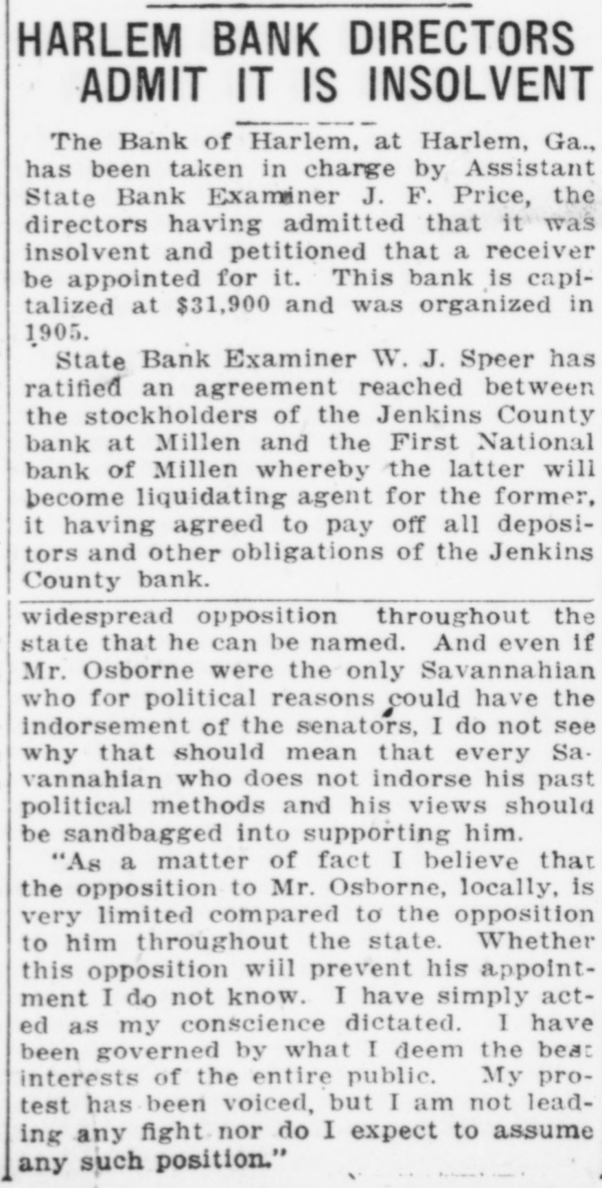HARLEM BANK DIRECTORS ADMIT IT IS INSOLVENT The Bank of Harlem, at Harlem, Ga., has been taken in charge by Assistant State Bank Examiner J. F. Price, the directors having admitted that it was insolvent and petitioned that a receiver be appointed for it. This bank is capitalized at $31,900 and was organized in 1905. State Bank Examiner W. J. Speer has ratified an agreement reached between the stockholders of the Jenkins County bank at Millen and the First National bank of Millen whereby the latter will become liquidating agent for the former, it having agreed to pay off all depositors and other obligations of the Jenkins County bank. widespread opposition throughout the state that he can be named. And even if Mr. Osborne were the only Savannahian who for political reasons could have the indorsement of the senators, I do not see why that should mean that every Sa. vannahian who does not indorse his past political methods and his views should be sandbagged into supporting him. "As a matter of fact I believe that the opposition to Mr. Osborne, locally, is very limited compared to the opposition to him throughout the state. Whether this opposition will prevent his appointment I do not know. I have simply acted as my conscience dictated. I have been governed by what I deem the best interests of the entire public. My protest has been voiced, but I am not leading any fight nor do I expect to assume any such position."