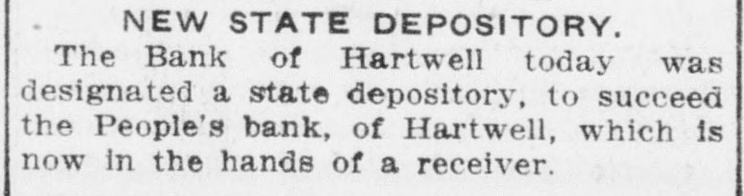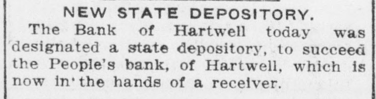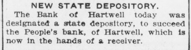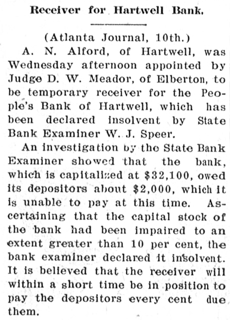 Receiver for Hartwell Bank. (Atlanta Journal, 10th.) A. N. Alford, of Hartwell, was Wednesday afternoon appointed by Judge D. W. Meador, of Elberton, to be temporary receiver for the People's Bank of Hartwell, which has been declared insolvent by State Bank Examiner W. J. Speer. An investigation by the State Bank Examiner showed that the bank, which is capitalized at $32,100, owed its depositors about $2,000, which it is unable to pay at this time. Ascertaining that the capital stock of the bank had been impaired to an extent greater than 10 per cent, the bank examiner declared it insolvent. It is believed that the receiver will within a short time be in position to pay the depositors every cent due them.