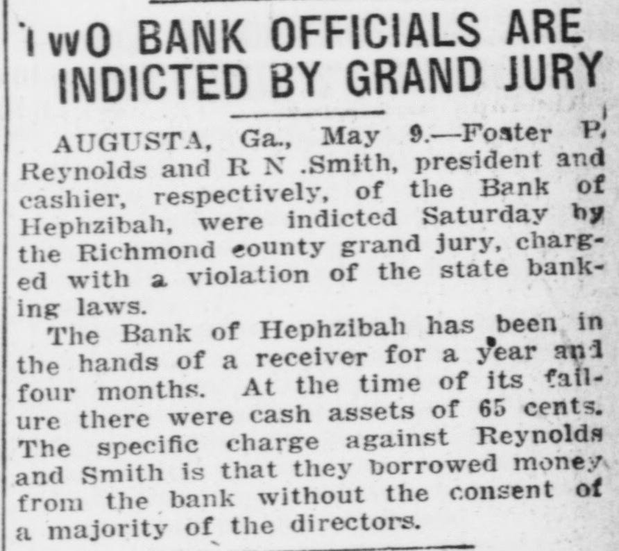 iwo BANK OFFICIALS ARE INDICTED BY GRAND JURY AUGUSTA, Ga., May 9.-Foster P. Reynolds and R N Smith, president and cashier, respectively, of the Bank of Hephzibah, were indicted Saturday by the Richmond county grand jury, charged with a violation of the state banking laws. The Bank of Hephzibah has been in the hands of a receiver for a year and four months. At the time of its failure there were cash assets of 65 cents. The specific charge against Reynolds and Smith is that they borrowed money from the bank without the consent of a majority of the directors.