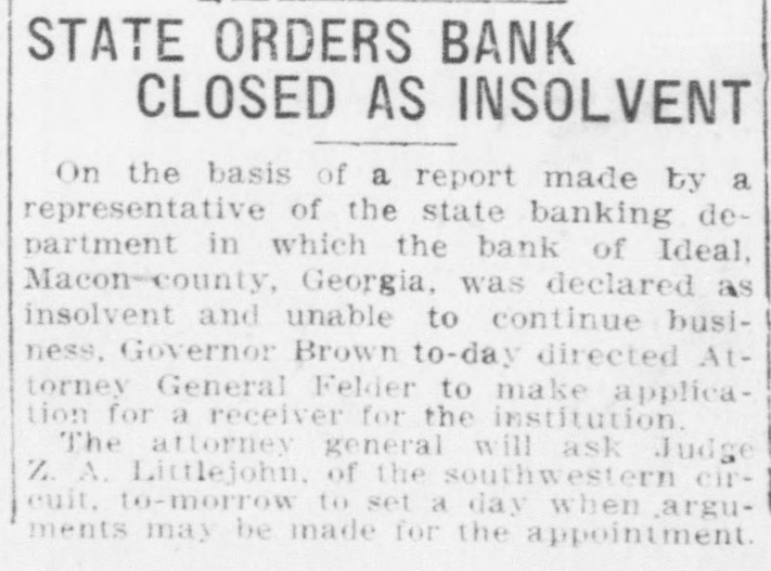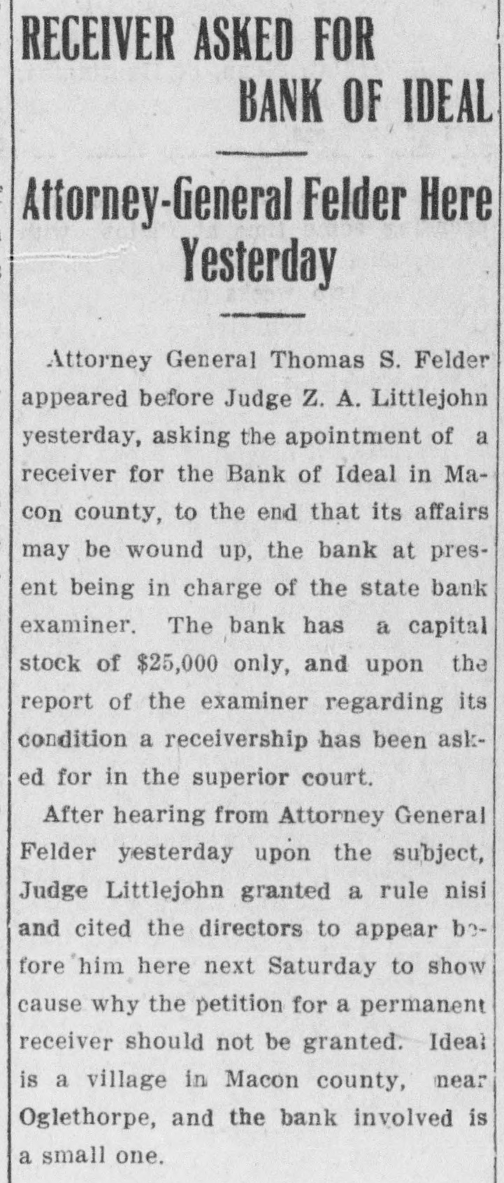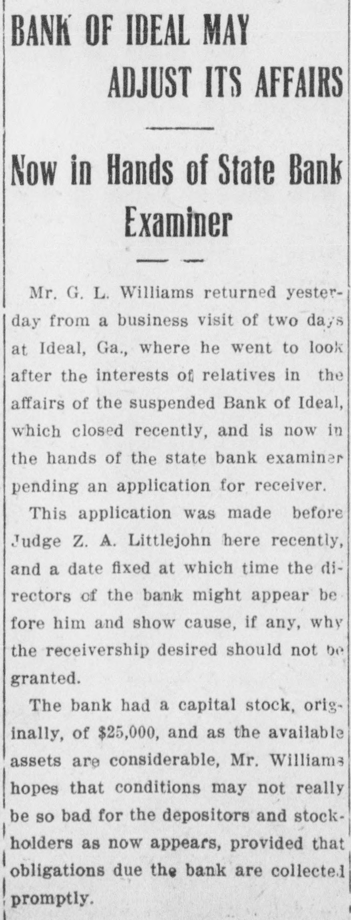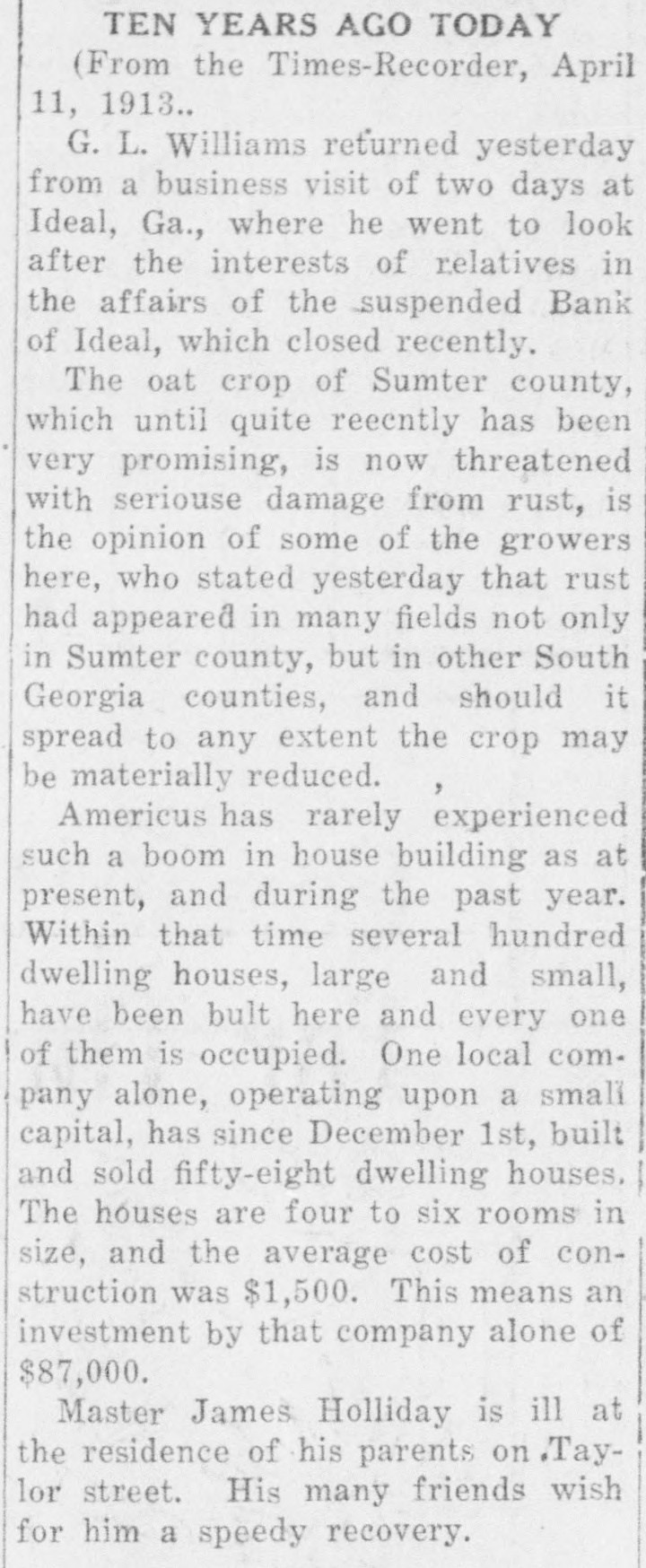 TEN YEARS AGO TODAY (From the Times-Recorder, April 11, 1913.. G. L. Williams returned yesterday from a business visit of two days at Ideal, Ga., where he went to look after the interests of relatives in the affairs of the .suspended Bank of Ideal, which closed recently. The oat crop of Sumter county, which until quite reecntly has been very promising, is now threatened with seriouse damage from rust, is the opinion of some of the growers here, who stated yesterday that rust had appeared in many fields not only in Sumter county, but in other South Georgia counties, and should it spread to any extent the crop may be materially reduced. , Americus has rarely experienced such a boom in house building as at present, and during the past year. Within that time several hundred dwelling houses, large and small, have been bult here and every one of them is occupied. One local company alone, operating upon a small capital, has since December 1st, built and sold fifty-eight dwelling houses. The houses are four to six rooms in size, and the average cost of construction was $1,500. This means an investment by that company alone of $87,000. Master James Holliday is ill at the residence of his parents on Taylor street. His many friends wish for him a speedy recovery.