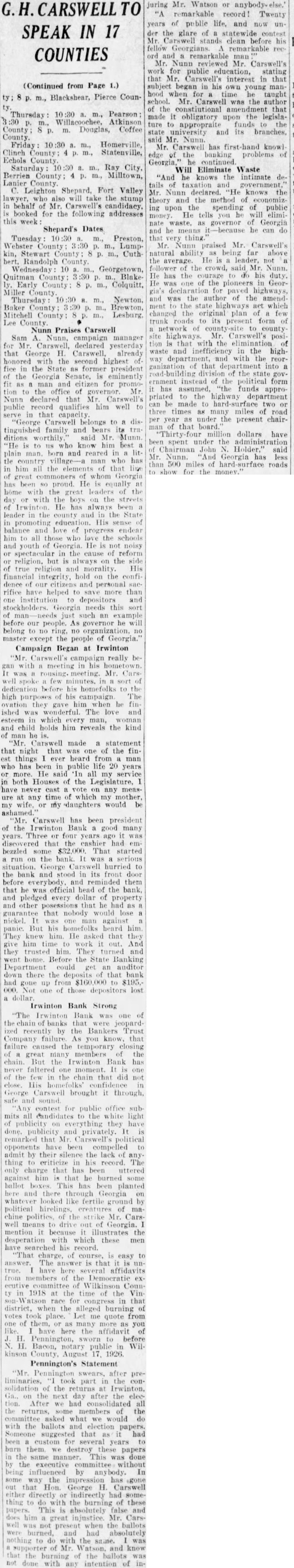 G. H. CARSWELL TO SPEAK IN 17 COUNTIES (Continued from Page 1.) ty; 8 p. m., Blackshear, Pierce Coun- ty Thursday 10:30 a. m., Pearson: 3:30 p. Willacoochee, Atkinson County; m. Douglas, Coffee Friday: 10:30 a. m., Homerville, Clinch County: m., Statenville, Echols County. Saturday a. m., Ray City, Berrien County: p. m., Milltown, Lanier County. C. Leighton Shepard, Fort Valley lawyer, who also will take the stump in behalf of Mr. Carswell's candidacy. booked for the following addresses this week: Shepard's Dates Tuesday 10:30 m., Preston, Webster 3:30 p. m., Lumpkin, Stewart County: p. m., Cuth Wednesday 10 m., Georgetown, Quitman County: 3:30 p. Blakely. Early County: 8 p. m., Colquitt, Miller County Thursday 10:30 m., Newton. Baker County 3:30 p. m., Brewton, Mitchell County m., Lesburg. Lee Nunn Praises Carswell Sam A. Nunn, campaign manager for Mr. Carswell, declared yesterday that George H. Carswell, already honored the second highest of fice in the State as former president of the Georgia Senate, is eminently fit as man and citizen for promotion to the office of governor. Mr. Nunn declared that Mr. Carswell's public record qualifies him well to serve in that capacity "George Carswell belongs to distinguished family and bears its traditions worthily said Mr. Munn. "He is us who know him best plain man. born and reared in little country village-a man who has him all the elements of that line great of whom Georgia has been so proud. He is equally at home great leaders of the day the boys on the streets of He has always been leader in the county and in the State in promoting education. His sense of balance and love of progress endear him all those who love the schools and youth of Georgia. He is not noisy or spectacular in the cause of reform religion. but is always on the true religion and morality. His financial integrity, hold on the confidence our and sacrifice have helped to save more than one institution to depositors and stockholders. Georgia needs this sort of needs just such an example before our people. As governor he will belong to ring, no organization. no master except the people of Georgia.' Campaign Began at Irwinton "Mr. Carswell's campaign really began with meeting in his hometown. It was Mr. Carswell spoke few sort dedication his homefolks to the high purposes of his campaign The ovation they gave him when he finished was wonderful. The love and esteem in which every man, woman and child holds him reveals the kind of man he is. "Mr. Carswell made a statement that night that was one of the finest things ever heard from man who has been in public life 20 years or more. He said 'In all my service in both Houses of the Legislature, have never cast vote on any measure at any time of which my mother, my wife or my daughters would be ashamed. "Mr. Carswell has been president of the Irwinton Bank good many years. Three four years ago was discovered that the cashier had embezzled some $32,000. That started a run on the bank. It was serious situation. George Carswell hurried to the bank and stood in its front door before everybody. and reminded them that was official head of the bank, and pledged every dollar of property and other that he had as guarantee that nobody would lose nickel. It was one man against panic. But his homefolks heard him. They knew him. He asked that they give him time to work it out. And they trusted him. They turned and went home. Before the State Banking Department could get an auditor down there the of that bank had gone up from to $195, 000. Not one of those depositors lost dollar Irwinton Bank Strong "The Irwinton Bank was one of the chain of banks that were jeopardized recently by the Bankers Trust Company failure As you know, that failure caused the temporary closing of great many members of the chain. But the Irwinton Bank has never faltered one moment. is one of the few in the chain that did not close. His George Carswell brought it through. safe and sound Any contest for public office submits all candidates to white light of publicity on everything they have done. publicity and privately It is remarked that Mr Carswell's opponents have been compelled to admit by their silence the lack of anything to criticize in his record. The only charge that has been uttered against him that he burned some ballot boxes This has been planted here and there through Georgia on whatever looked like fertile ground by political hirelings, creatures of machine polities, of the Mr. Carswell means to drive out of Georgia. mention it because illustrates the desperation with which these men have searched his record. "That charge, of course, is easy to answer. The answer is that is untrue. have here affidavits from members of the Democratic exilkinson County in 1918 at the time of the Vinson Watson race for in that district, when the alleged burning of votes took place. Let me quote from of them, as many more as you like have here the affidavit H. Pennington, before H. Bacon, notary public in Wilkinson County, August 17. 1926. Pennington's Statement "Mr. Pennington swears, after preliminaries, took part in the consolidation of the returns at Irwinton. Ga., on the next day after the election. After we had consolidated all the returns, some members of the asked what we would do with the ballots and election papers. suggested that as it had been custom for years to burn them. we destroy these papers the same manner. This was done by the executive committee without being influenced by anybody. In some way the impression has gone out that Hon. George H. Carswell either indirectly had something to do with the burning of these papers. This is absolutely false and does him great injustice. Mr. Cars well was not present when the ballots were burned, and had absolutely nothing to do with the same. was supporter of Mr. Vatson, and know that the of the ballots was not done with any intention of in- juring Mr. Watson or anybody-else.' "A remarkable record! Twenty years of public lif