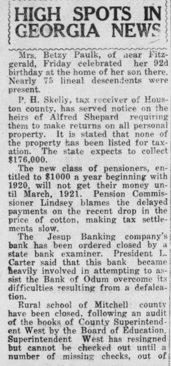 The defendant, on the stand Wednesday, reviewed his business career from the time he was making two dollars per week until he met with reverses in 1920. He insisted that the failure of the Jesup Banking company was due to the shortage in the accounts of Cashier Dickerson, of the Odum Banking company, an allied institution. He said also that his enterprises, including the Jesup bank, the Pickens company and the Jesup Mercantile company, were solvent, and could pay all claims if liquidation had been allowed in a businesslike manner. Every precaution had been taken, he declared, to properly safeguard the affairs of the bank. He even employed auditors to go over the accounts following the audit of the state examiners. Other evidence was introduced during the day to show that the Jesup Banking company was solvent when placed in receivers' hands. J. W. Talbert one of the receivers of the Pickens company and the Jesup Mercantile company, testified that from his information and examination these two companies were solvent and could be made to pay.