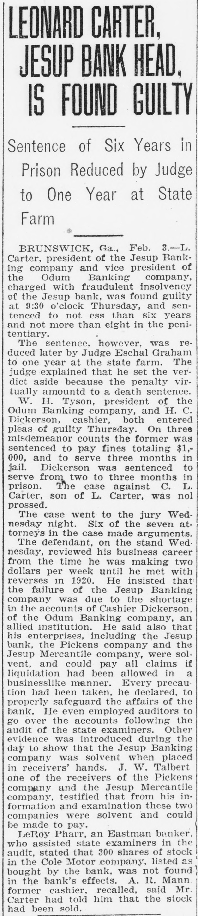 BRUNSWICK, Ga., Feb. 3.-L. Carter, president of the Jesup Banking company and vice president of the Odum Banking company, charged with fraudulent insolvency of the Jesup bank, was found guilty at 9:30 o'clock Thursday, and sentenced to not ess than six years and not more than eight in the penitentiary.