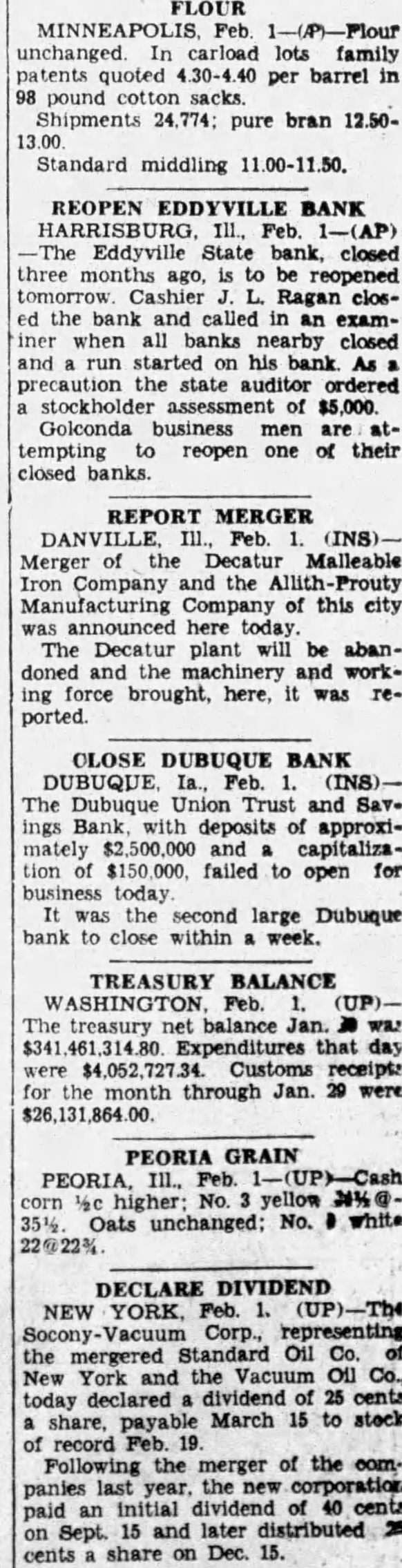 FLOUR unchanged In carload lots family patents 4.30-4.40 per barrel in 98 pound Shipments 24,774: pure bran 12.5013.00 Standard middling 11.00-11.50. REOPEN EDDYVILLE BANK HARRISBURG, Ill., Feb. 1-(AP) Eddyville State bank, closed three months ago, is to be reopened tomorrow Cashier Ragan closed the bank and called in examiner when all banks nearby closed and started on his bank As precaution state auditor ordered stockholder assessment $5,000 Golconda business are tempting to reopen one of their closed REPORT MERGER DANVILLE (INS). Merger of the Malleable Company and the Manufacturing of this city announced here today. The Decatur plant will be abandoned and the and working force brought, here, it was reported. CLOSE DUBUQUE BANK DUBUQUE Ia., Feb. (INS)The Dubuque Union Trust and Savings Bank, with deposits of approximately $2,500,000 and capitalization $150,000, failed to open for business today It the second large Dubuque bank close within week. TREASURY BALANCE The treasury net balance Jan was $341 Expenditures that day were $4,052,727.34 Customs receipts for month through Jan 29 were $26,131,864.00 PEORIA GRAIN 1/2c higher: No. yellow 351/2 Oats unchanged; No. white DECLARE DIVIDEND NEW YORK, (UP)-Th4 Corp., representing the mergered Standard Oil Co. and the Vacuum Oil Co., today declared 25 share, payable March 15 to stock of record Feb Following the merger of the last year the paid initial dividend of 40 cents on Sept. 15 and later distributed cents share on Dec. 15.