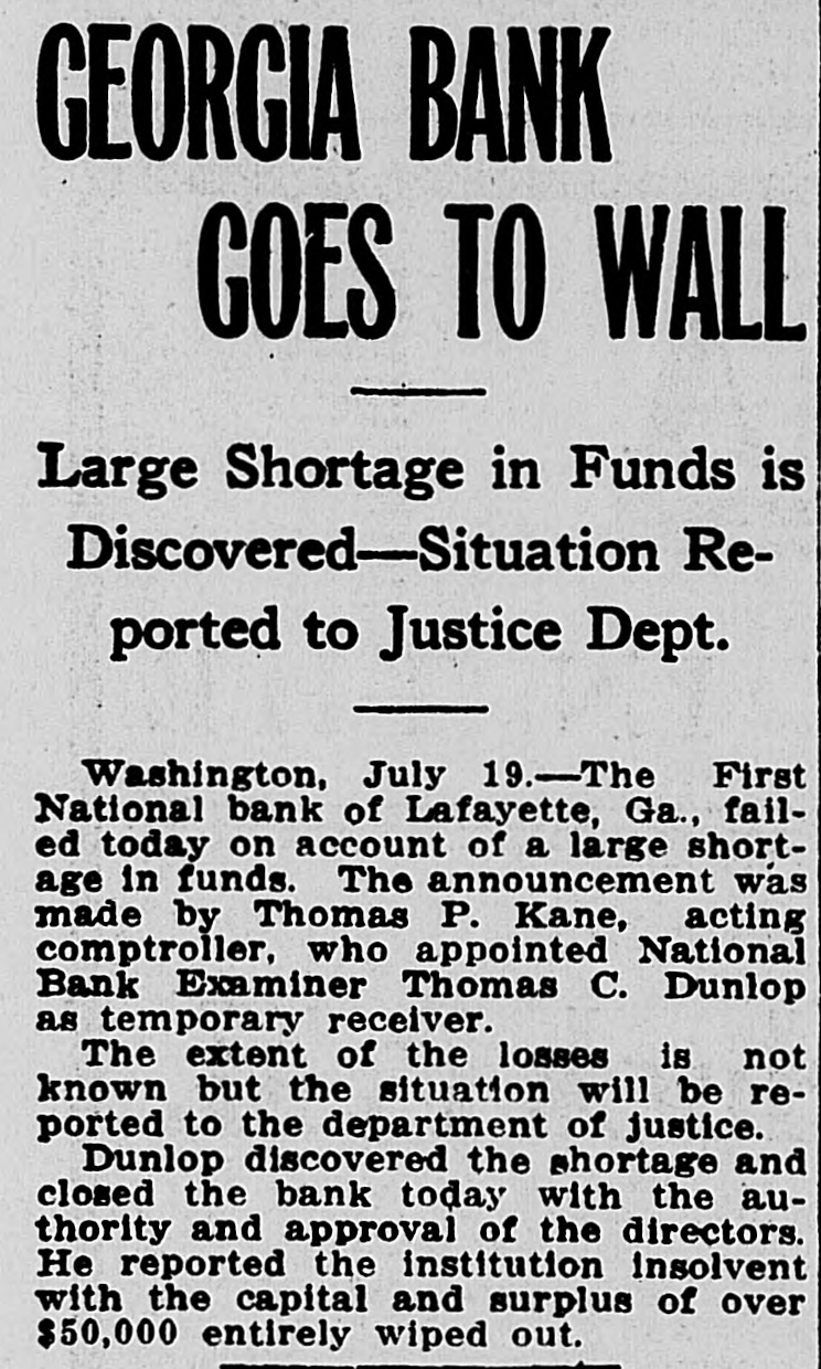 GEORGIA BANK GOES TO WALL Large Shortage in Funds is Discovered-Situation Reported to Justice Dept. Washington, July 19.-The First National bank of Lafayette, Ga., failed today on account of a large shortage in funds. The announcement was made by Thomas P. Kane, acting comptroller, who appointed National Bank Examiner Thomas C. Dunlop as temporary receiver. The extent of the losses is not known but the situation will be reported to the department of justice. Dunlop discovered the shortage and closed the bank today with the authority and approval of the directors. He reported the institution insolvent with the capital and surplus of over $50,000 entirely wiped out.