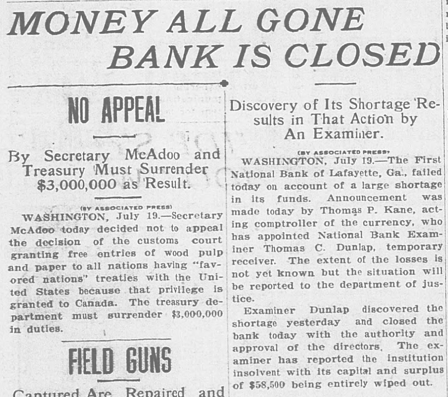 MONEY ALL GONE BANK IS CLOSED Discovery of Its Shortage ReNO APPEAL sults in That Action by An Examiner. (BY ASSOCIATED PRESS, By Secretary MeAdoo and WASHINGTON, July 19.-The First National Bank of Lafayette, Ga., failed Treasury Must Surrender today on account of a large shortage $3,000,000 as Result. in its funds. Announcement was (BY ASSOCIATED PRESS) made today by Thomas P. Kane, actWASHINGTON, July 19.-Secretary ing comptroller of the currency, who McAdoo today decided not to appeal has appointed National Bank Examthe decision of the customs court iner Thomas C. Dunlap, temporary granting free entries of wood pulp receiver. The extent of the losses is and paper to all nations having "favnot yet known but the situation will ored nations" treaties with the Unibe reported to the department of justed States because that privilege is tice. granted to Canada. The treasury deExaminer Dunlap discovered the partment must surrender $3,000,000 shortage yesterday and closed the in duties. bank today with the authority and approval of the directors. The examiner has reported the institution FIELD GUNS insolvent with its capital and surplus of $58,500 being entirely wiped out. Cantured Are Repaired and