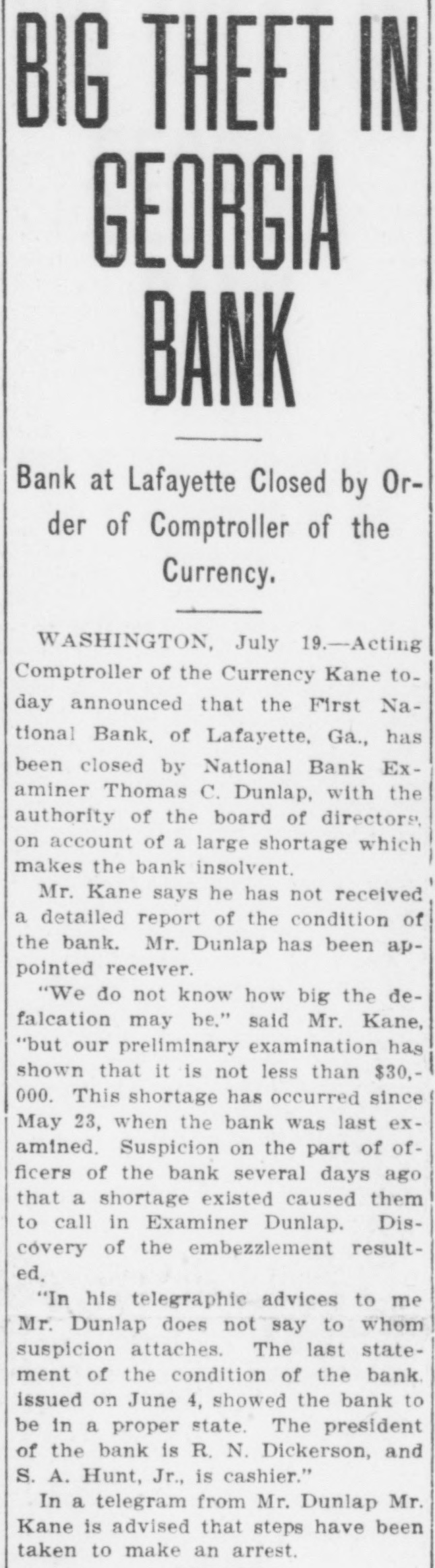 BIG THEFT IN GEORGIA BANK Bank at Lafayette Closed by Order of Comptroller of the Currency. WASHINGTON, July 19.-Acting Comptroller of the Currency Kane today announced that the First National Bank, of Lafayette, Ga., has been closed by National Bank Examiner Thomas C. Dunlap, with the authority of the board of directors, on account of a large shortage which makes the bank insolvent. Mr. Kane says he has not received a detailed report of the condition of the bank. Mr. Dunlap has been appointed receiver. "We do not know how big the defalcation may be." said Mr. Kane, "but our preliminary examination has shown that it is not less than $30,000. This shortage has occurred since May 23, when the bank was last examined. Suspicion on the part of officers of the bank several days ago that a shortage existed caused them to call in Examiner Dunlap. Discovery of the embezzlement resulted. "In his telegraphic advices to me Mr. Dunlap does not say to whom suspicion attaches. The last statement of the condition of the bank. issued on June 4, showed the bank to be in a proper state. The president of the bank is R. N. Dickerson, and S. A. Hunt, Jr., is cashier." In a telegram from Mr. Dunlap Mr. Kane is advised that steps have been taken to make an arrest.