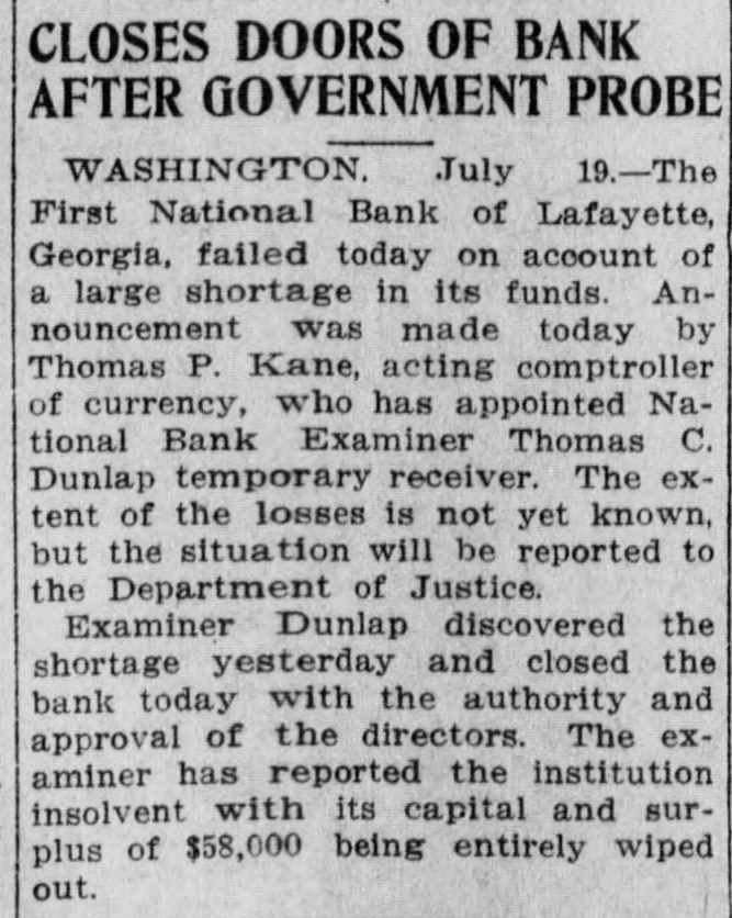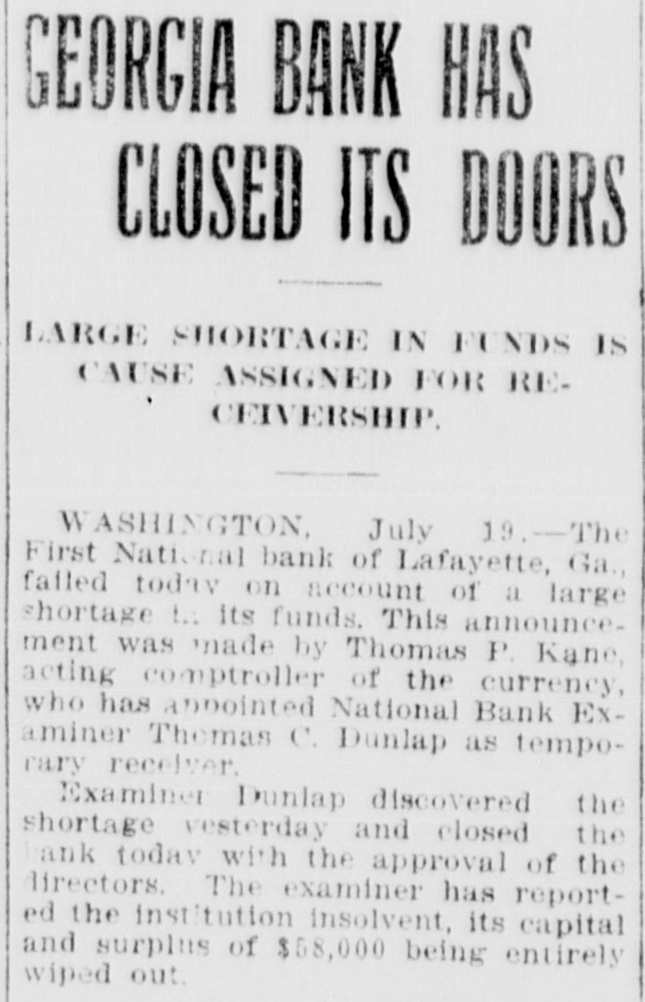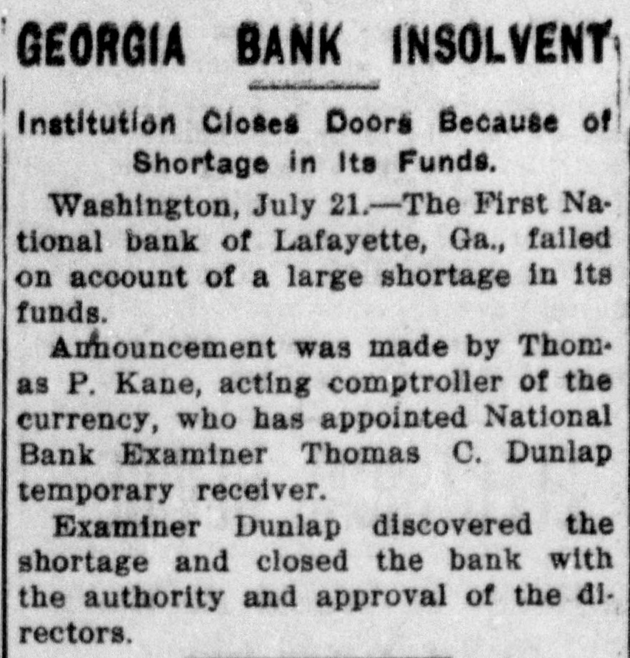 GEORGIA BANK INSOLVENT Institution Closes Doors Because of Shortage in Its Funds. Washington, July 21.-The First National bank of Lafayette, Ga., failed on account of a large shortage in its funds. Announcement was made by Thom. as P. Kane, acting comptroller of the currency, who has appointed National Bank Examiner Thomas C. Dunlap temporary receiver. Examiner Dunlap discovered the shortage and closed the bank with the authority and approval of the directors.