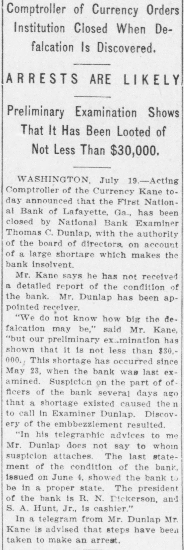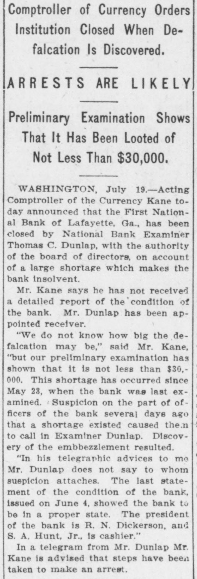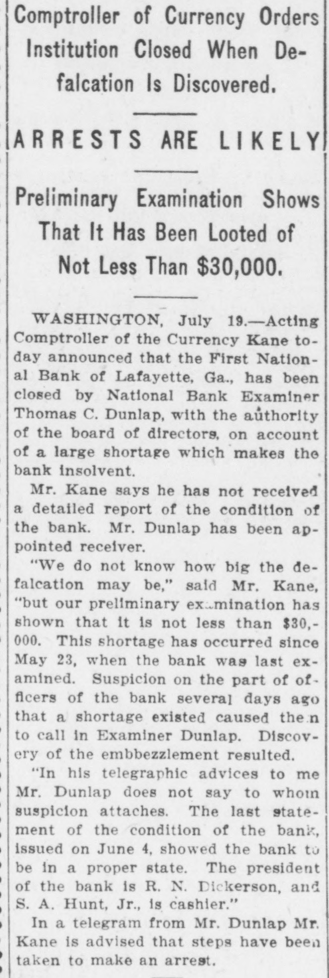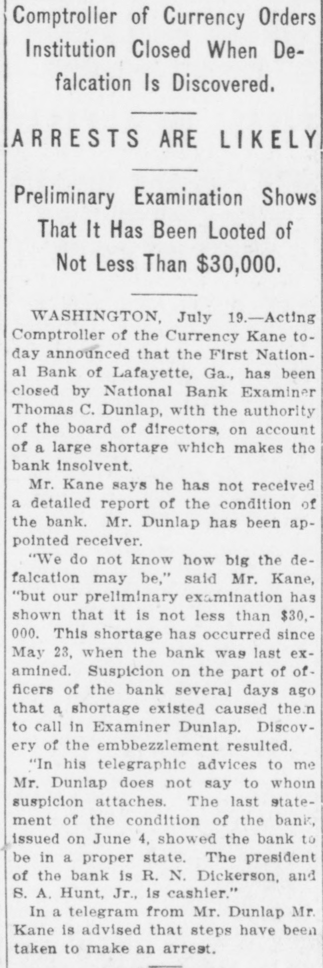 Comptroller of Currency Orders Institution Closed When Defalcation Is Discovered. ARRESTS ARE LIKELY Preliminary Examination Shows That It Has Been Looted of Not Less Than $30,000. WASHINGTON, July 19.-Acting Comptroller of the Currency Kane today announced that the First National Bank of Lafayette, Ga., has been closed by National Bank Examiner Thomas C. Dunlap, with the authority of the board of directors, on account of a large shortage which makes the bank insolvent. Mr. Kane says he has not received a detailed report of the condition of the bank. Mr. Dunlap has been appointed receiver. "We do not know how big the defalcation may be," said Mr. Kane, "but our preliminary examination has shown that it is not less than $30,000. This shortage has occurred since May 23, when the bank was last examined. Suspicion on the part of officers of the bank several days ago that a shortage existed caused the n to call in Examiner Dunlap. Discovery of the embbezzlement resulted. "In his telegraphic advices to me Mr. Dunlap does not say to whom suspicion attaches. The last statement of the condition of the bank, issued on June 4, showed the bank to be in a proper state. The president of the bank is R. N. Dickerson, and S. A. Hunt, Jr., is cashier." In a telegram from Mr. Dunlap Mr. Kane is advised that steps have been taken to make an arrest.