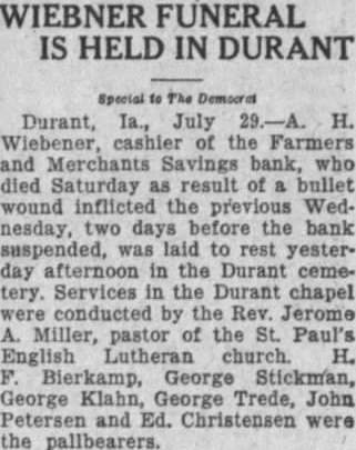 WIEBNER FUNERAL IS HELD IN DURANT Durant, July Wiebener, cashier the Farmers and Merchants Savings bank, who died Saturday result of bullet wound inflicted the previous Wed. nesday, two days before the bank suspended, was laid to rest yesterday afternoon in the Durant cemetery. Services in the Durant chapel conducted the Rev. Jerome Miller, pastor of the St. Paul's English Lutheran church. H. George Stickman, George Klahn, George Trede, John Petersen and Ed. Christensen were the pallbearers.