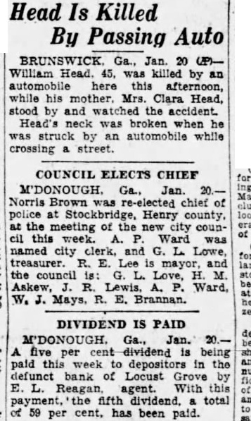 Head Is Killed By Passing Auto BRUNSWICK, Ga., Jan. 20 (P)William Head. 45, was killed by an automobile here this afternoon, while his mother. Mrs. Clara Head, stood by and watched the accident. Head's was broken when he was struck by automobile while crossing street. COUNCIL ELECTS CHIEF M'DONOUGH Ga., Jan. Norris was re-elected chief of police at Stockbridge, Henry at the meeting of the city cil this week. Ward named city and G. Lowe, treasurer. E. Lee mayor, and the council is: Love, Askew, R. Lewis, P. Ward, W. J. Mays, R. E. Brannan. DIVIDEND IS PAID Ga., Jan. 20. A five per cent dividend is being and paid this week to depositors in the defunct bank of Locust Grove E. L. Reagan agent. With payment, the fifth dividend. a total 59 per cent, has been paid.