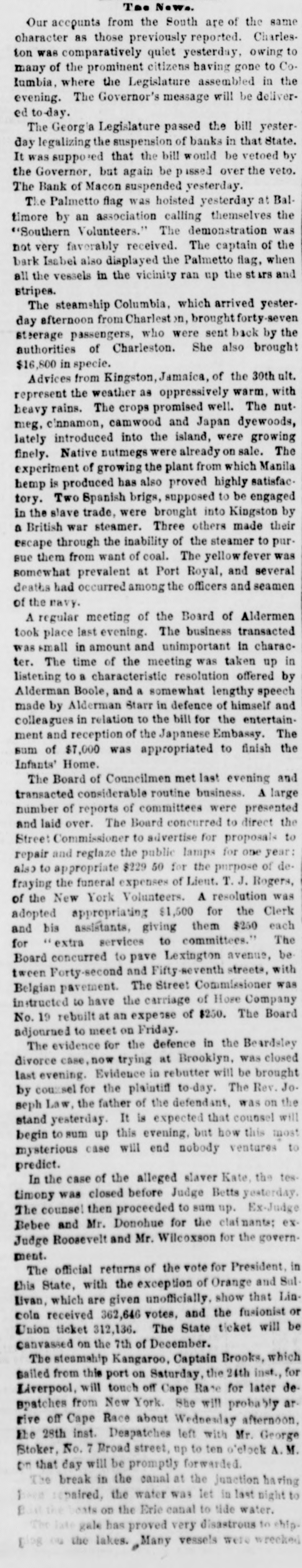 Tax News. Our accounts from the South are of the same character as those previously reported. Charleston was comparatively quiet yesterday, owing to many of the prominent citizens having gone to Columbia, where the Legislature assembled in the evening. The Governor's message will be delivered to-day. The Georgia Legislature passed the bill yesterday legalizing the suspension of banks in that State. It was supposed that the bill would be vetoed by the Governor, but again be issed over the veto. The Bank of Macon suspended yesterday. The Palmetto flag was hoisted yesterday at Baltimore by an association calling themselves the "Southern Volunteers." The demonstration was not very favorably received. The captain of the bark Isabel also displayed the Palmetto flag, when all the vessels in the vicinity ran up the st ars and stripes. The steamship Columbia, which arrived yesterday afternoon from Charlest on, brought forty-seven steerage passengers, who were sent back by the authorities of Charleston. She also brought $16,800 in specie. Advices from Kingston, Jamaica, of the 30th ult. represent the weather as oppressively warm, with heavy rains. The crops promised well. The nut. meg, cinnamon, camwood and Japan dyewoods, lately introduced into the island, were growing finely. Native nutmegs were already on sale. The experiment of growing the plant from which Manila hemp is produced has also proved highly satisfactory. Two Spanish brigs, supposed to be engaged in the slave trade, were brought into Kingston by a British war steamer. Three others made their escape through the inability of the steamer to pursue them from want of coal. The yellow fever was somewhat prevalent at Port Royal, and several deaths had occurred among the officers and seamen of the navy. A regular meeting of the Board of Aldermen took place last evening. The business transacted was small in amount and unimportant in character. The time of the meeting was taken up in listening to a characteristic resolution offered by Alderman Boole, and a somewhat lengthy speech made by Alderman Starr in defence of himself and colleagues in relation to the bill for the entertainment and reception of the Japanese Embassy. The sum of $7,000 was appropriated to finish the Infants' Home. The Board of Councilmen met last evening and transacted considerable routine business. A large number of reports of committees were presented and laid over. The Board concurred to direct the Street Commissioner to advertise for proposals to repair and reglaze the public lamps for one year: also to appropriate $229 50 for the purpose of defraying the funeral expenses of Lieut. T. J. Rogers, of the New York Volunteers. A resolution was adopted appropriating $1,500 for the Clerk and bis assistants, giving them $250 each for "extra services to committees." The Board concurred to pave Lexington avenue, be tween Forty-second and Fifty-seventh streets, with Belgian pavement. The Street Commissioner was instructed to have the carriage of Hose Company No. 19 rebuilt at an expense of $250. The Board adjourned to meet on Friday. The evidence for the defence in the Beardsley divorce case, now trying at Brooklyn, was closed last evening. Evidence in rebutter will be brought by coursel for the plaintiff to-day. The Rev. Jo. seph Law, the father of the defendant, was on the stand yesterday. It is expected that counsel will begin to sum up this evening, but how this most mysterious case will end nobody ventures to predict. In the case of the alleged slaver Kate, the testimony was closed before Judge Betts yesterday. The counse! then proceeded to sum up. Ex-Judge Bebee and Mr. Donohue for the claimants: exJudge Roosevelt and Mr. Wilcoxson for the government. The official returns of the vote for President, in this State, with the exception of Orange and Sul Livan, which are given unofficially. show that Lincoln received 362,646 votes, and the fusionist or Union ticket 312,136. The State ticket will be canvassed on the 7th of December. The steamship Kangaroo, Captain Brooks, which sailed from this port on Saturday, the 24th inst., for Liverpool, will touch off Cape Race for later despatches from New York. She will probably argive off Cape Race about Wednesday afternoon, the 28th inst. Despatches left with Mr. George Stoker, No. 7 Broad street, up to ten o'clock A. M. on that day will be promptly forwarded. The break in the canal at the junction having paired, the water was let in last night to on the Erie canal to tide water. The gale has proved very disastrous to chipthe lakes. Many vessels were wrecked