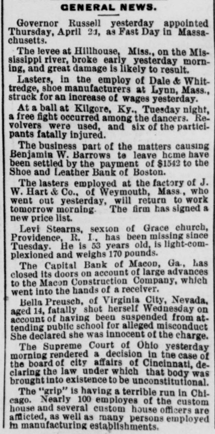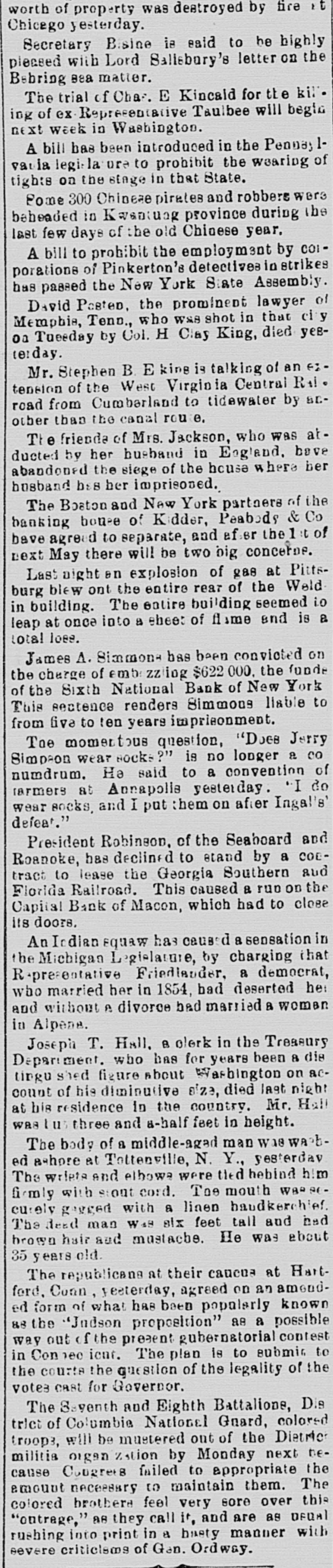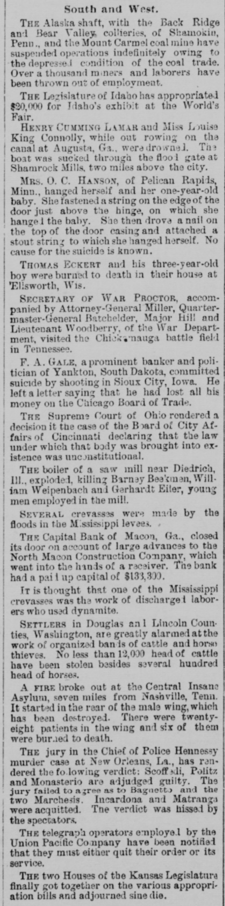 South and West. THE Alaska shaft, with the Back Ridge and Bear Valley, collieries, of Shamokin, Penn., and the Mount Carmel coal mine have suspended operations indefinitely owing to the depressed condition of the coal trade. Over a thousand miners and laborers have been thrown out of employment. THE Legislature of Idaho has appropriated $20,000 for Idaho's exhibit at the World's Fair. HENRY CUMMING LAMAR and Miss Louise King Connolly, while out rowing on the canal at Augusta, Ga., veradrownel. The boat was sucked through the flood gate at Shamrock Mills, two miles above the city. MRS. O.C. HANSON, of Pelican Rapids, Minn., hanged herself and her one-year-old She a on on door baby. just above fastened the She string hinge, then drova the which edge nail of she the on hangel the baby. a the top of the door casing and attached a stout string to which she hanged herself. No cause for the suicide is known. THOMAS ECKERT and his three-year-old boy were burned to death in their house at Elisworth, Wis. SECRETARY OF WAR PROCTOR, accompanied by Attorney-General Miller, Quartermaster-General Batchelder, Major Hill and Lieutenant Woodberry, of the War Department, visited the Chicken mauga battle field in Tennessee. F.A. GALE, a prominent banker and politician of Yankton, South Dakota, committed suicide by shooting in Sioux City, Iowa. He left a letter saying that he had lost all his money on the Chicago Board of Trade. THE Supreme Court of Ohio rendered a decision it the case of the Board of City Affairs of Cincinnati declaring that the law under which that body was brought into existence was nconstitutional. THE boiler of a saw mill near Diedrich, III.,exploded, killing Barney Beekmen, Willinm Weipenbach and Gerhardt Eiter, young men employed in the mill. SEVERAL crevasses were made by the floods in the Mississippi levees. THE Capital Bank of Macon, Ga., closed its door on account of large advances to the North Macon Construction Company, which went into the hands of a receiver. The bank had a paid up capital of $133,300. IT is thought that one of the Mississippi crevasses was the work of discharge: laborers who used dynamite. SETTLERS in Douglas an1 Lincoln Counties, Washington, are greatly alarmed at the work of organized bands of cattle and horse thieves. No less than 12,000 head of cattle have been stolen besides several hundred head of horses. A FIRE broke out at the Central Insane Asylum, seven miles from Nashville, Tenn. It started in the rear of the male wing, which has been destroyed. There were twentyeight patients in the wing and six of them were burned to death. THE jury in the Chief of Police Hennessy murder case at New Orleans, La., has randered the fo lowing verdict: Scoffed Politz and Monasterio are adjudged guilty. The jury failed to agree as to Bagnetto and the two Marchesis. Incardona and Matranga were acquitted. The verdict was hissed by the spectators. THE telegraph operators employe.l by the Union Pacific Company have been notified that they must either quit their order or its service. THE two Houses of the Kansas Legislatura finally got together on the various appropriation bills and adjourned sine die.