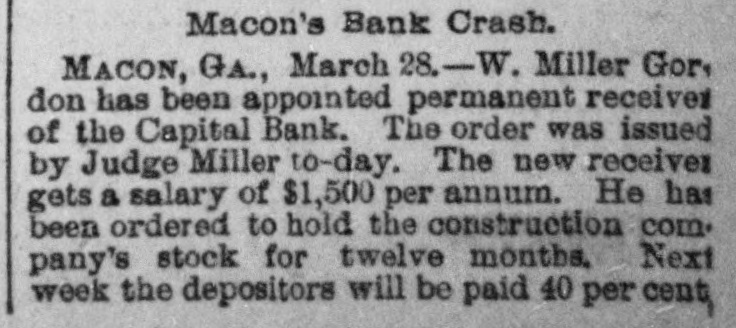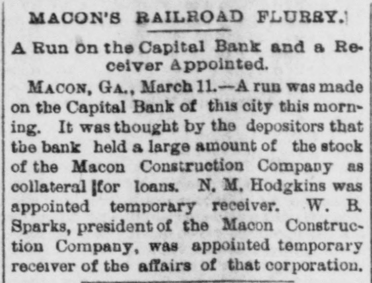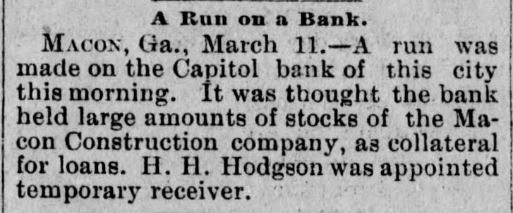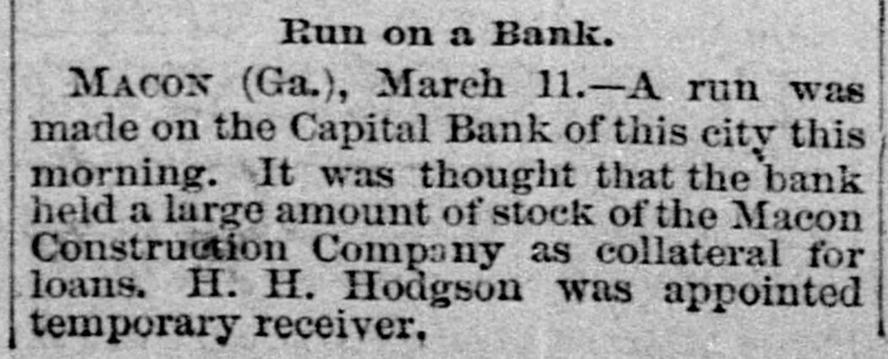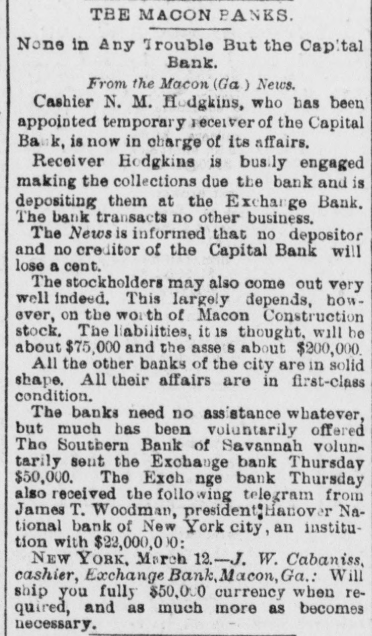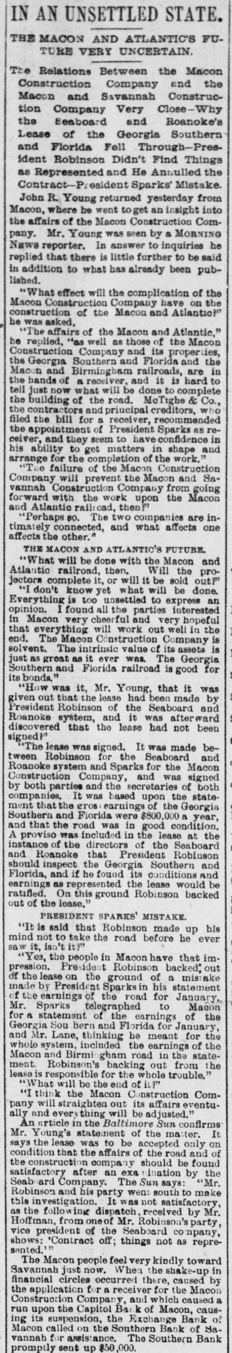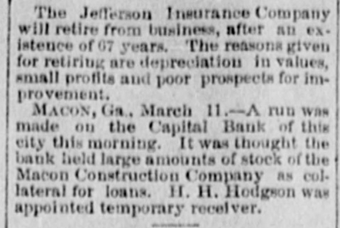 South and West. THE Alaska shaft, with the Back Ridge and Bear Valley, collieries, of Shamokin, Penn., and the Mount Carmel coal mine have suspended operations indefinitely owing to the depressed condition of the coal trade. Over a thousand miners and laborers have been thrown out of employment. THE Legislature of Idaho has appropriated $20,000 for Idaho's exhibit at the World's Fair. HENRY CUMMING LAMAR and Miss Louise King Connolly, while out rowing on the canal at Augusta, Ga., veradrownel. The boat was sucked through the flood gate at Shamrock Mills, two miles above the city. MRS. O.C. HANSON, of Pelican Rapids, Minn., hanged herself and her one-year-old She a on on door baby. just above fastened the She string hinge, then drova the which edge nail of she the on hangel the baby. a the top of the door casing and attached a stout string to which she hanged herself. No cause for the suicide is known. THOMAS ECKERT and his three-year-old boy were burned to death in their house at Elisworth, Wis. SECRETARY OF WAR PROCTOR, accompanied by Attorney-General Miller, Quartermaster-General Batchelder, Major Hill and Lieutenant Woodberry, of the War Department, visited the Chicken mauga battle field in Tennessee. F.A. GALE, a prominent banker and politician of Yankton, South Dakota, committed suicide by shooting in Sioux City, Iowa. He left a letter saying that he had lost all his money on the Chicago Board of Trade. THE Supreme Court of Ohio rendered a decision it the case of the Board of City Affairs of Cincinnati declaring that the law under which that body was brought into existence was nconstitutional. THE boiler of a saw mill near Diedrich, III.,exploded, killing Barney Beekmen, Willinm Weipenbach and Gerhardt Eiter, young men employed in the mill. SEVERAL crevasses were made by the floods in the Mississippi levees. THE Capital Bank of Macon, Ga., closed its door on account of large advances to the North Macon Construction Company, which went into the hands of a receiver. The bank had a paid up capital of $133,300. IT is thought that one of the Mississippi crevasses was the work of discharge: laborers who used dynamite. SETTLERS in Douglas an1 Lincoln Counties, Washington, are greatly alarmed at the work of organized bands of cattle and horse thieves. No less than 12,000 head of cattle have been stolen besides several hundred head of horses. A FIRE broke out at the Central Insane Asylum, seven miles from Nashville, Tenn. It started in the rear of the male wing, which has been destroyed. There were twentyeight patients in the wing and six of them were burned to death. THE jury in the Chief of Police Hennessy murder case at New Orleans, La., has randered the fo lowing verdict: Scoffed Politz and Monasterio are adjudged guilty. The jury failed to agree as to Bagnetto and the two Marchesis. Incardona and Matranga were acquitted. The verdict was hissed by the spectators. THE telegraph operators employe.l by the Union Pacific Company have been notified that they must either quit their order or its service. THE two Houses of the Kansas Legislatura finally got together on the various appropriation bills and adjourned sine die.