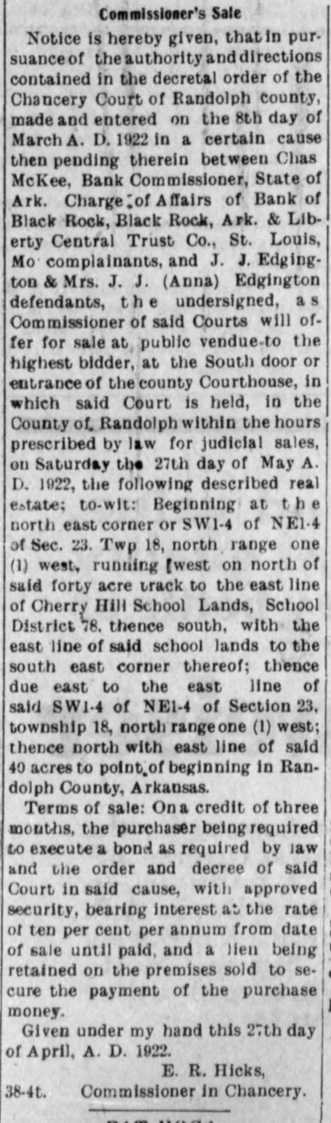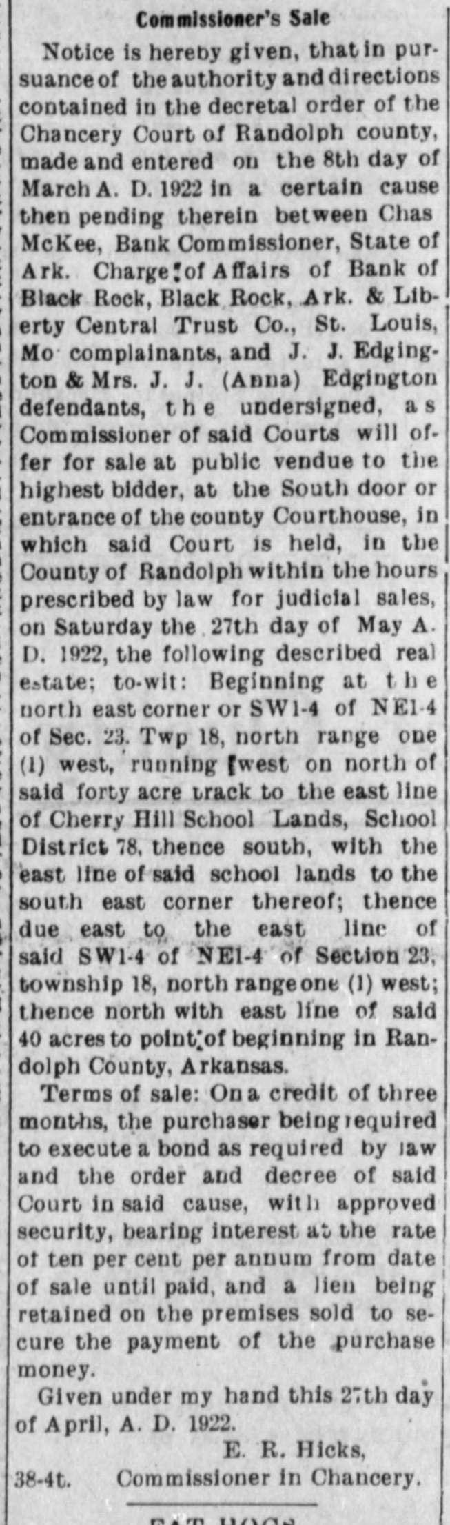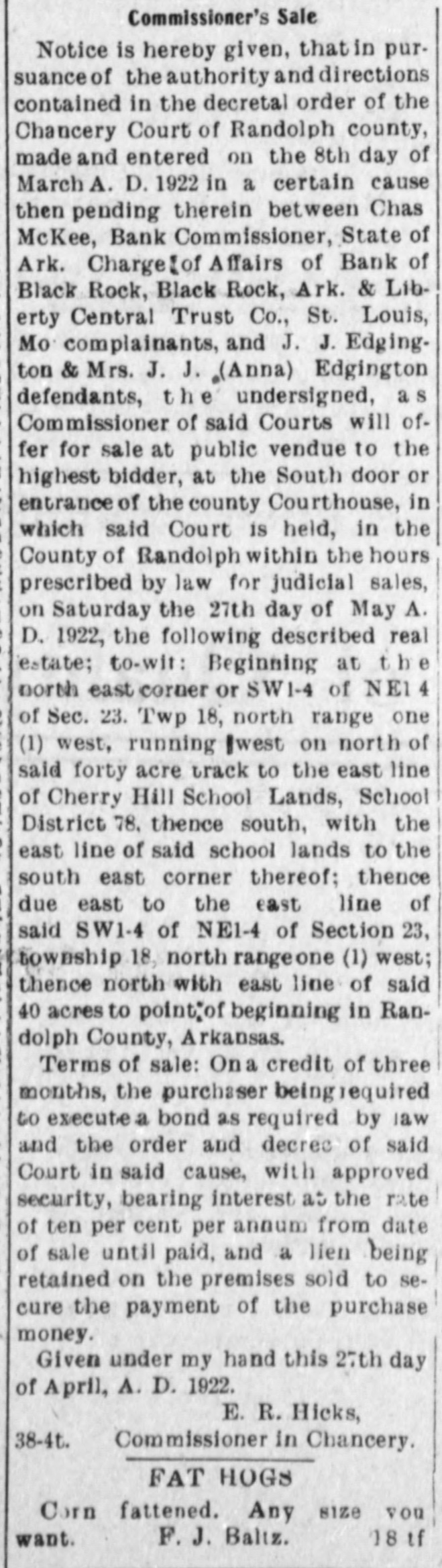 Commissioner's Sale Notice is hereby given, thatin pursuance of the authority and directions contained in the decretal order of the Chancery Court of Randolph county, made and entered on the 8th day of March A. D. 1922 in a certain cause then pending therein between Chas McKee, Bank Commissioner, State of Ark. Charge[of Affairs of Bank of Black Rock, Black Rock, Ark. & Liberty Central Trust Co., St. Louis, Mo complainants, and J. J. Edgington & Mrs. J. J. (Anna) Edgington defendants, the undersigned, as Commissioner of said Courts will offer for sale at public vendue to the highest bidder, at the South door or entrance of the county Courthouse, in which said Court is held, in the County of Randolph within the hours prescribed by law for judicial sales, on Saturday the 27th day of May A. D. 1922, the following described real estate; to-wit: Beginning at t b e north east corner or SW1-4 of NE1 4 of Sec. 23. Twp 18, north range one (1) west, running Iwest on north of said forty acre track to the east line of Cherry Hill School Lands, School District 78, thence south, with the east line of said school lands to the south east corner thereof; thence due east to the east line of said SW1-4 of NE1-4 of Section 23, township 18, north rangeone (1) west; thence north with east line of said 40 acres to point"of beginning in Randolph County, Arkansas. Terms of sale: Ona credit of three months, the purchaser beingiequired to execute a bond as required by law and the order and decree of said Court in said cause, with approved security, bearing interest at the rate of ten per cent per annum from date of sale until paid, and a lien being retained on the premises sold to secure the payment of the purchase money. Given under my hand this 27th day of April, A. D. 1922. E. R. Hicks, 38-4t. Commissioner in Chancery. FAT HOGS Corn fattened. Any size you F. J. Baltz. 18 if want.