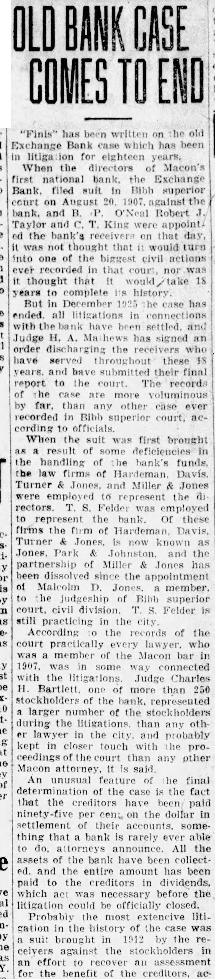 CASE TO Litigation That Began 18 Years Ago in Courts Here Has Been Terminated has been written Exchange Bank case which has been in litigation for eighteen years. When the directors of Macon's first national bank. the Exchange Bank, filed suit Bibb superior court on August the bank. and O'Neal Robert and King appointthe bank's on that day, was not thought that would turn into of biggest civil actions recorded in that court, nor thought that would take 18 years complete history. But December 1925 case has ended. all litigations in connections with have been settled. and Judge Mathews has signed order discharging the receivers who have served throughout these 18 years. and have submitted their final report to the court. The records case are more voluminous far, than any other case recorded in Bibb superior court. according officials. When the suit was first brought Continued on Page Two Bill Would Make Seats Automatic; Country to Be Divided Into 4 Parts bill which has for its the automatic placing of members from the southeastern states the bench of the Commerce Commission, was introduced here today by Senator Smith. of South Carolina. The bill in brief provides that upits passage the United States shall be divided into four geographical sections twelve members the commission instead of eleven time. Four these members would come from section, that an equal number from the northeastern. northwestern, southeastern southwestern. While present sitting members not displaced ordinarily the bill would require the president point, unon vacancy members from that section not then represented. For Instance. проп vacancy curring in New York West Virginia, California or otherwise. then would be necessary to name some one from Georgia, one of the Carolinas. or Continued on Page Two