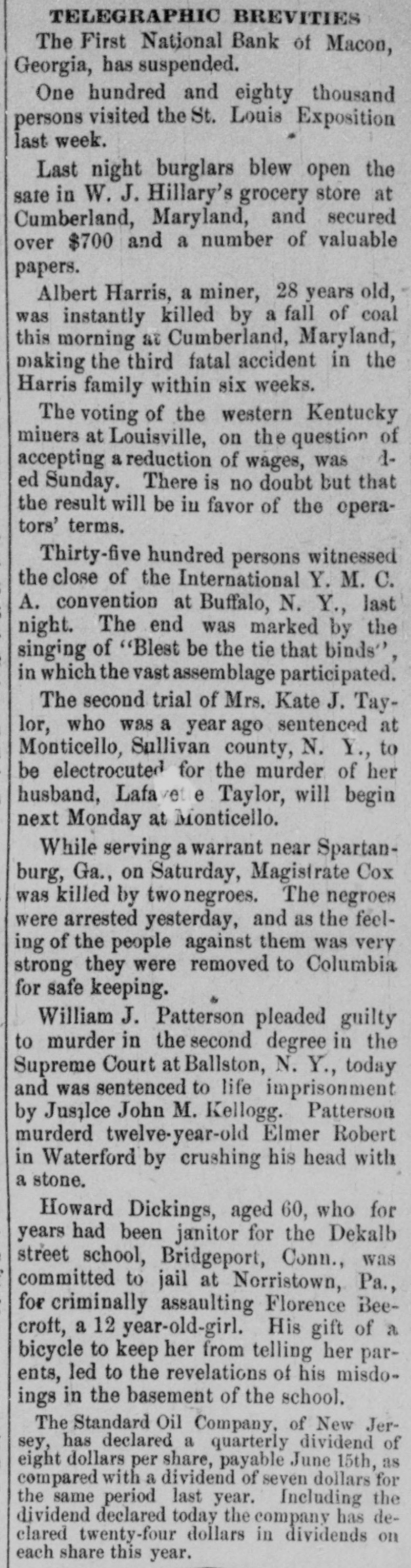TELEGRAPHIC BREVITIES The First National Bank of Macon, Georgia, has suspended. One hundred and eighty thousand persons visited the St. Louis Exposition last week. Last night burglars blew open the safe in W. J. Hillary's grocery store at Cumberland, Maryland, and secured over $700 and a number of valuable papers. Albert Harris, a miner, 28 years old, was instantly killed by a fall of coal this morning at Cumberland, Maryland, making the third fatal accident in the Harris family within six weeks. The voting of the western Kentucky miners at Louisville, on the question of accepting a reduction of wages, was ded Sunday. There is no doubt but that the result will be in favor of the eperators' terms. Thirty-five hundred persons witnessed the close of the International Y.M.C. A. convention at Buffalo, N. Y., last night. The end was marked by the singing of "Blest be the tie that binds", in which the vast assemblage participated. The second trial of Mrs. Kate J. Taylor, who was a year ago sentenced at Monticello, Sullivan county, N. Y., to be electrocuted for the murder of her husband, Lafavel e Taylor, will begin next Monday at Monticello. While serving a warrant near Spartanburg, Ga., on Saturday, Magistrate Cox was killed by twonegroes. The negroes were arrested yesterday, and as the feeling of the people against them was very strong they were removed to Columbia for safe keeping. William J. Patterson pleaded guilty to murder in the second degree in the Supreme Court at Ballston, N. Y., today and was sentenced to life imprisonment by Jusilce John M. Kellogg. Patterson murderd twelve-year-old Elmer Robert in Waterford by crushing his head with a stone. Howard Dickings, aged 60, who for years had been janitor for the Dekalb street school, Bridgeport, Conn., was committed to jail at Norristown, Pa., for criminally assaulting Florence Beecroft, a 12 year-old-girl. His gift of a bicycle to keep her from telling her parents, led to the revelations of his misdoings in the basement of the school. The Standard Oil Company, of New Jersey, has declared a quarterly dividend of eight dollars per share, payable June 15th, as compared with a dividend of seven dollars for same dividend the declared period last today year. the company Including has the declared twenty-four dollars in dividends on each share this year.