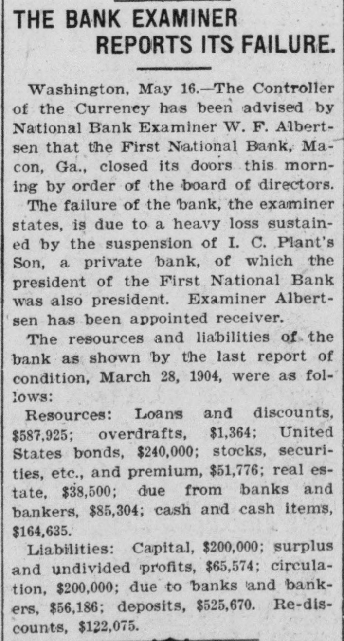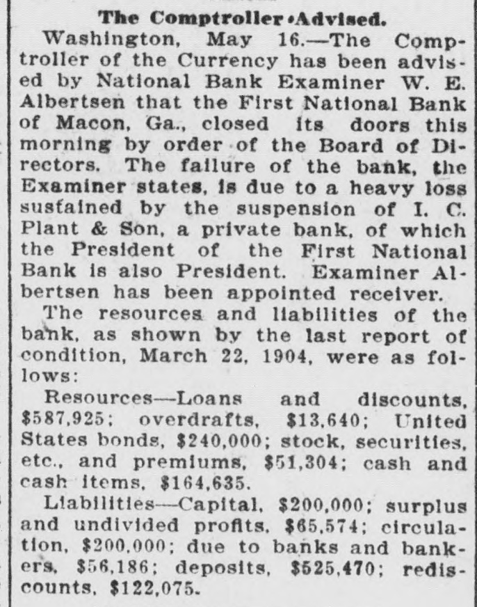 The Comptroller:Advised. Washington, May 16.-The Comptroller of the Currency has been advised by National Bank Examiner W. E. Albertsen that the First National Bank of Macon, Ga., closed its doors this morning by order of the Board of Directors. The failure of the bank, the Examiner states, is due to a heavy loss sustained by the suspension of I. C. Plant & Son, a private bank, of which the President of the First National Bank is also President. Examiner Albertsen has been appointed receiver. The resources and liabilities of the bank, as shown by the last report of condition, March 22. 1904, were as follows: Resources-Loans and discounts, $587,925 overdrafts, $13,640; United States bonds, $240,000; stock, securities, etc., and premiums, $51,304; cash and cash items, $164,635. Liabilities-Capital, $200,000; surplus and undivided profits. $65,574; circulation, $200,000; due to banks and bankers, $56,186; deposits, $525,470; rediscounts, $122,075.