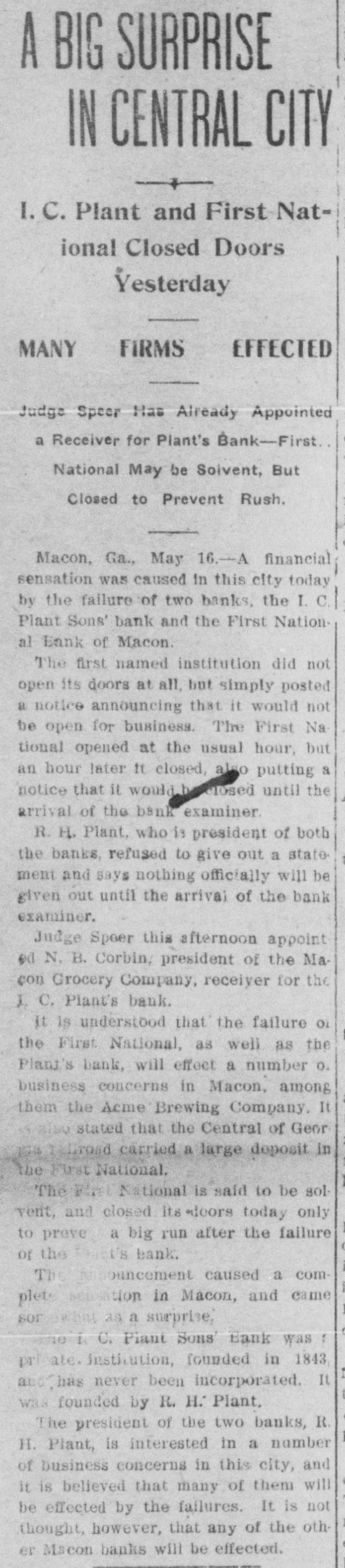 A BIG SURPRISE IN CENTRAL CITY I. C. Plant and First National Closed Doors Yesterday FIRMS MANY EFFECTED Judge Speer Has Already Appointed a Receiver for Plant's Bank-First National May be Solvent, But Closed to Prevent Rush. Macon, Ga., May 16.-A financial sensation was caused in this city today by the failure of two banks, the I. C. Plant Sons' bank and the First Nation al Bank of Macon. The first named institution did not open its doors at all, but simply posted a notice announcing that it would not be open for business. The First Na tional opened at the usual hour, but an hour later It closed, also putting a notice that it would b closed until the arrival of the bank examiner. R. H. Plant, who is president of both the banks, refused to give out a state ment and says nothing officially will be given out until the arrival of the bank examiner. Judge Speer this afternoon appoint ed N. B. Corbin, president of the Macon Grocery Company, receiver for the I C. Plant's bank. it is understood that the failure OI the First National, as well as the Plant's bank, will effect a number O. business concerns in Macon, among them the Acme Brewing Company, It also stated that the Central of Geor 154 I-Groad carried a large deposit in the First National. The First National is said to be solvent, and closed its alcors today only to preve a big run after the failure or the thit's bank. The ouncement caused a complet sensation in Macon, and came as a surprise, THE 1. C. Piant Sons Bank was : pri ale. institution, founded in 1843, and. has never been incorporated. It was founded by R. H. Plant, The president of the two banks, R. H. Plant, is interested in a number of business concerns in this city, and it is believed that many of them will be effected by the failures. It is not thought, however, that any of the other Mscon banks will be effected.