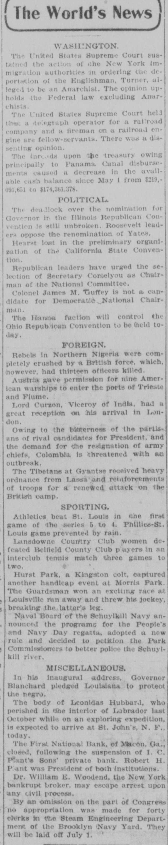 The World's News WASHINGTON. The United States Supreme Court sustained the action of the New York immigration authorities in ordering the deportation of the Englishman, Turner, alleged to be an Anarchist. The opinion upholds the Federal law excluding Anarchists. The United States Supreme Court held that a telegraph operator for a railroad company and a fireman on a railroad engine are fellow-servants. There was a dissenting opinion. The inreads upon the treasury owing principally to Panama Canal disbursements caused a decrease in the available cash balance since May 1 from $219,091,651 to $174,361,378. POLITICAL. The deadlock over the nomination for Governor in the Illinois Republican Convention is still unbroken. Roosevelt leaders oppose the renomination of Yates. Hearst lost in the preliminary organization of the California State Convention. Republican leaders have urged the selection of Secretary Contelyou as Chairman of the National Committee. Colonel James M. Guffey is not a candidate for Democratic National Chairman. The Hanna faction will control the Ohio Republican Convention to be held toJay. FOREIGN. Rebels in Northern Nigeria were completely crushed by a British force, which, however, had thirteen officers killed. Austria gave permission for nine American warships to enter the ports of Trieste and Flume. Lord Curzon, Viceroy of India, had a great reception on his arrival in London. Owing to the bitterness of the partisans of rival candidates for President, and the demand for the resignation of army chiefs, Colombia is threatened with an outbreak. The Tibetans at Gyantse received heavy ordnance from Lassa and reinforcements of troops for a renewed attack on the British camp. SPORTING. Athletics beat St. Louis in the first game of the series 5 to 4. Phillies-St. Louis game prevented by rain. Lansdowne Country Club women defeated Belfield County Club players in an interclub tennis match three games to two. Hurst Park, a Kingston colt, captured another handicap event at Morris Park. The Guardsman won an exciting race at Louisville ran away and threw his jockey, breaking the latter's leg. Naval Board of the Schuylkill Navy announced the programs for the People's and Navy Day regatta, adopted a new rule and decided to petition the Park Commissioners to better police the Schuylkill river. MISCELLANEOUS. In his inaugural address, Governor Blanchard pledged Louisiana to protect the negro. The body of Leonidas Hubbard, who perished in the interior of Labrador last October while on an exploring expedition, is expected to arrive at St. John's, N. F., today. The First National Bank, of Macon, Cha., closed, following the suspension of I. C. Plant's Sons' private bank. Robert H. Plant was President of both Institutions. Dr. William E. Woodend, the New York bankrupt broker, may escape arrest upon any civil process. By an omission on the part of Congress no appropriation was made for forty clerks in the Steam Engineering Department of the Brooklyn Navy Yard. They will be laid off July 1.