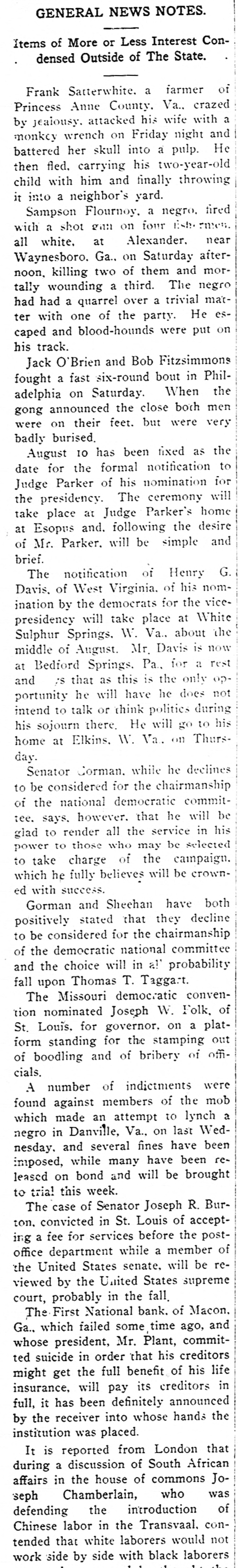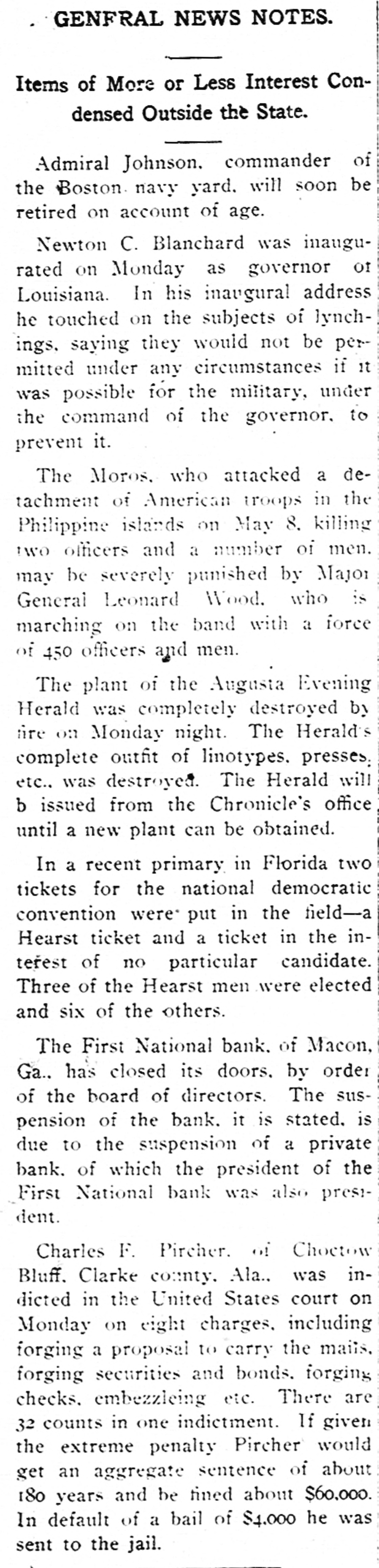 GENFRAL NEWS NOTES. Items of More or Less Interest Condensed Outside the State. Admiral Johnson. commander of the Boston. navy yard. will soon be retired on account of age. Newton C. Blanchard was inaugurated on Monday as governor of Louisiana. In his inaugural address he touched on the subjects of lynchings, saying they would not be permitted under any circumstances if It was possible for the military, under the command of the governor. to prevent it. The Moros. who attacked a detachment of American troops in the Philippine islands on May 8. killing two officers and a number of men. may be severely punished by Major General Leonard Wood. who is marching on the band with a force of 450 officers and men. The plant of the Augusta Evening Herald was completely destroyed by fire on Monday night. The Herald's complete outfit of linotypes. presses: etc., was destroyed. The Herald will b issued from the Chronicle's office until a new plant can be obtained. In a recent primary in Florida two tickets for the national democratic convention were put in the field-a Hearst ticket and a ticket in the interest of no particular candidate. Three of the Hearst men were elected and six of the others. The First National bank. of Macon, Ga.. has closed its doors. by order of the board of directors. The suspension of the bank. it is stated. is due to the suspension of a private bank. of which the president of the First National bank was also president. Charles F. Pircher. of Choctow Bluff. Clarke county. Ala., was indicted in the United States court on Monday on eight charges. including forging a proposal to carry the mails, forging securities and bonds. forging checks. embezzleing etc. There are 32 counts in one indictment. If given the extreme penalty Pircher would get an aggregate sentence of about 180 years and be fined about $60,000. In default of a bail of $4,000 he was sent to the jail.
