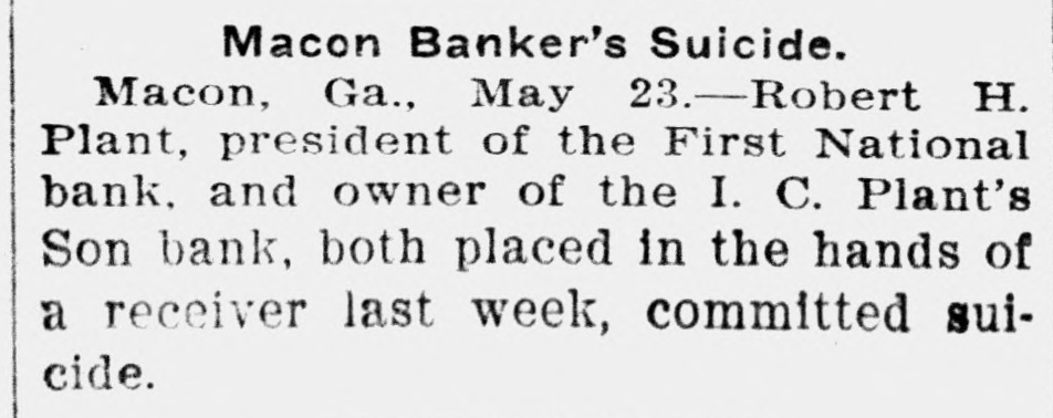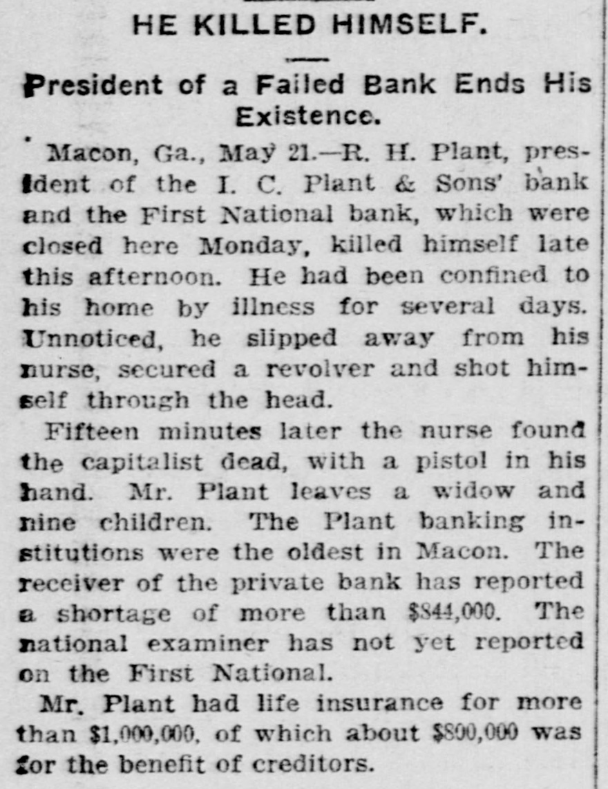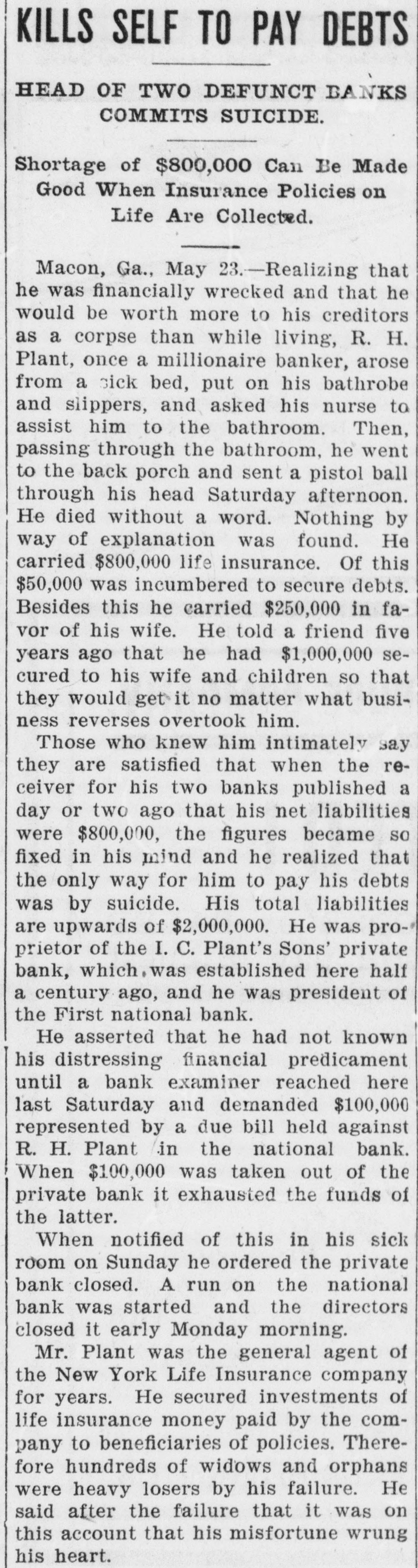 KILLS SELF TO PAY DEBTS HEAD OF TWO DEFUNCT BANKS COMMITS SUICIDE. Shortage of $800,000 Can Be Made Good When Insurance Policies on Life Are Collected. Macon, Ga., May 23.-Realizing that he was financially wrecked and that he would be worth more to his creditors as a corpse than while living, R. H. Plant, once a millionaire banker, arose from a sick bed, put on his bathrobe and slippers, and asked his nurse to assist him to the bathroom. Then, passing through the bathroom, he went to the back porch and sent a pistol ball through his head Saturday afternoon. He died without a word. Nothing by way of explanation was found. He carried $800,000 life insurance. Of this $50,000 was incumbered to secure debts. Besides this he carried $250,000 in favor of his wife. He told a friend five years ago that he had $1,000,000 secured to his wife and children so that they would get it no matter what business reverses overtook him. Those who knew him intimately say they are satisfied that when the receiver for his two banks published a day or two ago that his net liabilities were $800,000, the figures became so fixed in his mind and he realized that the only way for him to pay his debts was by suicide. His total liabilities are upwards of $2,000,000. He was pro-' prietor of the I. C. Plant's Sons' private bank, which, was established here half a century ago, and he was president of the First national bank. He asserted that he had not known his distressing financial predicament until a bank examiner reached here last Saturday and demanded $100,000 represented by a due bill held against R. H. Plant in the national bank. When $100,000 was taken out of the private bank it exhausted the funds of the latter. When notified of this in his sick room on Sunday he ordered the private bank closed. A run on the national bank was started and the directors closed it early Monday morning. Mr. Plant was the general agent of the New York Life Insurance company for years. He secured investments of life insurance money paid by the company to beneficiaries of policies. Therefore hundreds of widows and orphans were heavy losers by his failure. He said after the failure that it was on this account that his misfortune wrung his heart.