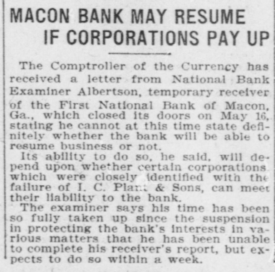 MACON BANK MAY RESUME IF CORPORATIONS PAY UP The Comptroller of the Currency has received a letter from National Bank Examiner Albertson, temporary receiver of the First National Bank of Macon, Ga., which closed its doors on May 16, stating he cannot at this time state definitely whether the bank will be able to resume business or not. Its ability to do so, he said, will depend upon whether certain corporations which were closely identified with the failure of I. C. Plant & Sons, can meet their liability to the bank. The examiner says his time has been so fully taken up since the suspension in protecting the bank's interests in various matters that he has been unable to complete his receiver's report, but expects to do so within a week.