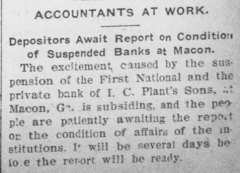 ACCOUNTANTS AT WORK. Depositors Await Report on Condition of Suspended Banks at Macon. The excitement, caused by the suspension of the First National and the private bank of I. C. Plant's Sons, it Macon, G2. is subsiding, and the people are patiently awaiting the report or the condition of affairs of the in. stitutions. It will be several days be 10.e the report will be ready.