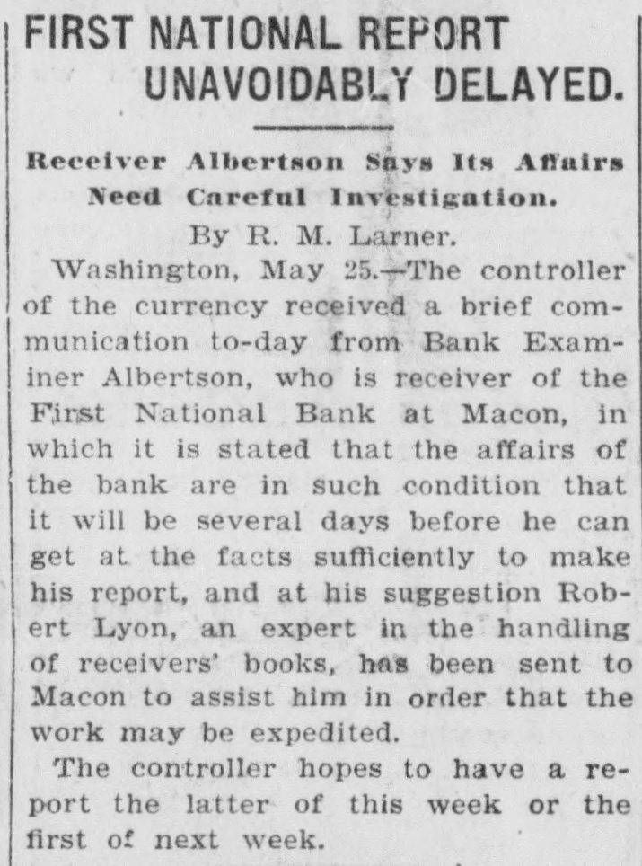FIRST NATIONAL REPORT UNAVOIDABLY DELAYED. Receiver Albertson Says Its Affairs Need Careful Investigation. By R. M. Larner. Washington, May 25.-The controller of the currency received a brief communication to-day from Bank Examiner Albertson, who is receiver of the First National Bank at Macon, in which it is stated that the affairs of the bank are in such condition that it will be several days before he can get at the facts sufficiently to make his report, and at his suggestion Robert Lyon, an expert in the handling of receivers' books, has been sent to Macon to assist him in order that the work may be expedited. The controller hopes to have a report the latter of this week or the first of next week.