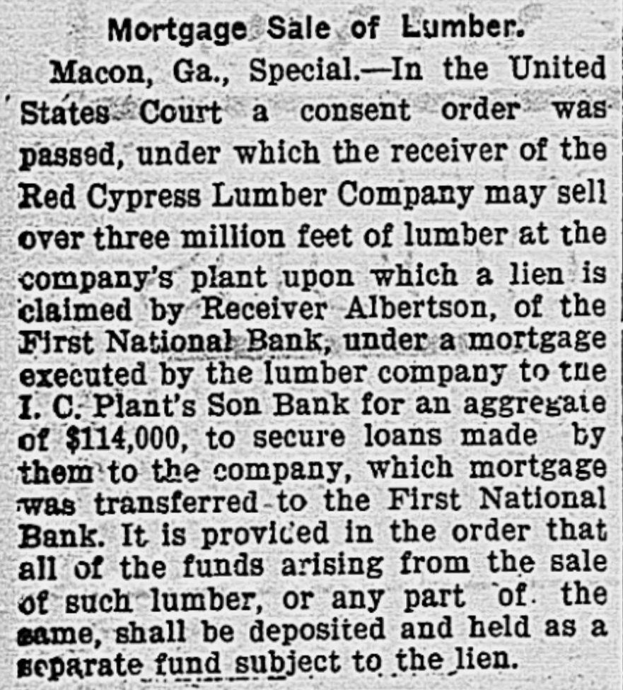 Mortgage Sale of Lumber. Macon, Ga., Special.-In the United States Court a consent order was passed, under which the receiver of the Red Cypress Lumber Company may sell over three million feet of lumber at the company's plant upon which a lien is claimed by Receiver Albertson, of the First National Bank, under a mortgage executed by the lumber company to tue I. C. Plant's Son Bank for an aggregate of $114,000, to secure loans made by them to the company, which mortgage was transferred to the First National Bank. It is provided in the order that all of the funds arising from the sale of such lumber, or any part of. the same, shall be deposited and held as a separate fund subject to the lien.